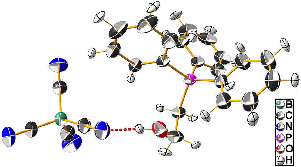 Equivalent amounts of K[B(CN)4] (250 mg, 1.624 mmol) and commercial [nPrPh3P]Br (626 mg), which was shown after the X-ray structure determination to contain a larger amount of 2-hydroxyethyl-triphenyl-phosphonium bromide as “impurity”, have been separately dissolved in acetonitrile (15 ml). Both colourless solutions were combined and stirred for approximately 5 min. The precipitated KBr was removed by centrifugation. The solvent of the decanted liquid was evaporated under reduced pressure by using a rotary evaporator. A colourless solid remained, which has been washed with diethylether (20 ml) and dried under reduced pressure. The recrystallization from CH3CN resulted in the growth of single crystals.