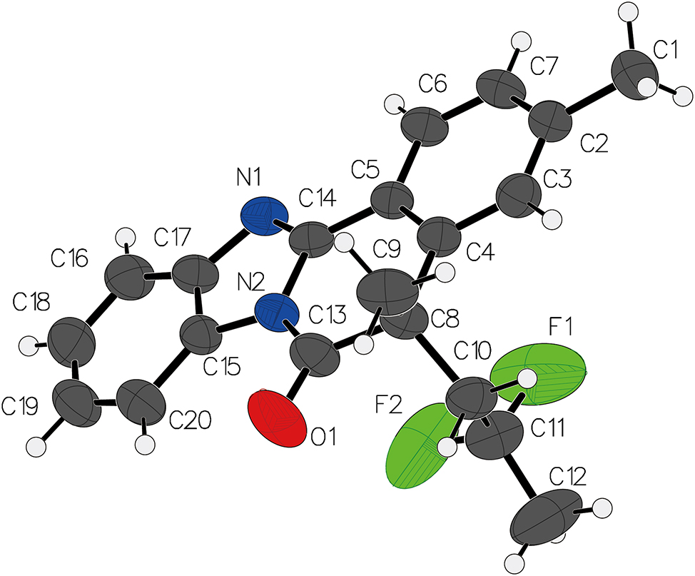 Home Crystal structure of 5-(2,2-difluoropropyl)-5-methylbenzo[4,5]imidazo[2,1-a] isoquinolin-6(5H)-one, C20H18F2N2O