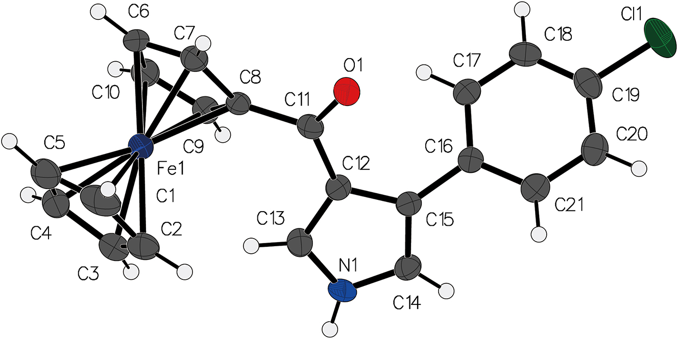 Home Crystal structure of (4-(4-chlorophenyl)-1H-pyrrole-3-carbonyl)ferrocene, C21H16ClFeNO
