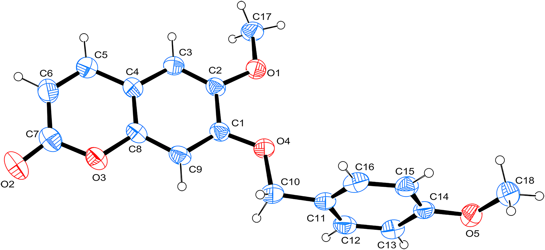 Single-crystal structure analysis revealed that the title compound crystallized in the triclinic space group P 1 . The asymmetric unit of the title compound 6-methoxy-7-[(4-methoxyphenyl)methoxy]-2H-1-benzopyran-2-one molecule. The ORTEP diagram is presented in figure. Bond lengths and angles are all in the expected ranges. All atoms on the benzopyrone scaffold structure are in the same plane, and the bond lengths of C7=O2, C7=O3 and C8=O3 are 1.204(2) Å, 1.380(3) Å and 1.378(2) Å, respectively, they are consistent with the results reported for similar compounds in the literature. 9