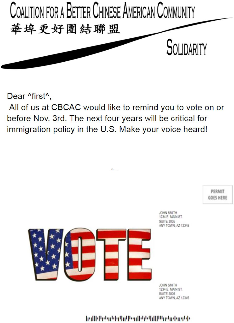Message 2: “Dear (subject name), All of us at [Nonprofit Name] would like to remind you to vote on Nov. 3rd. The next four years will be critical for immigration policy in the US, make your voice heard!”