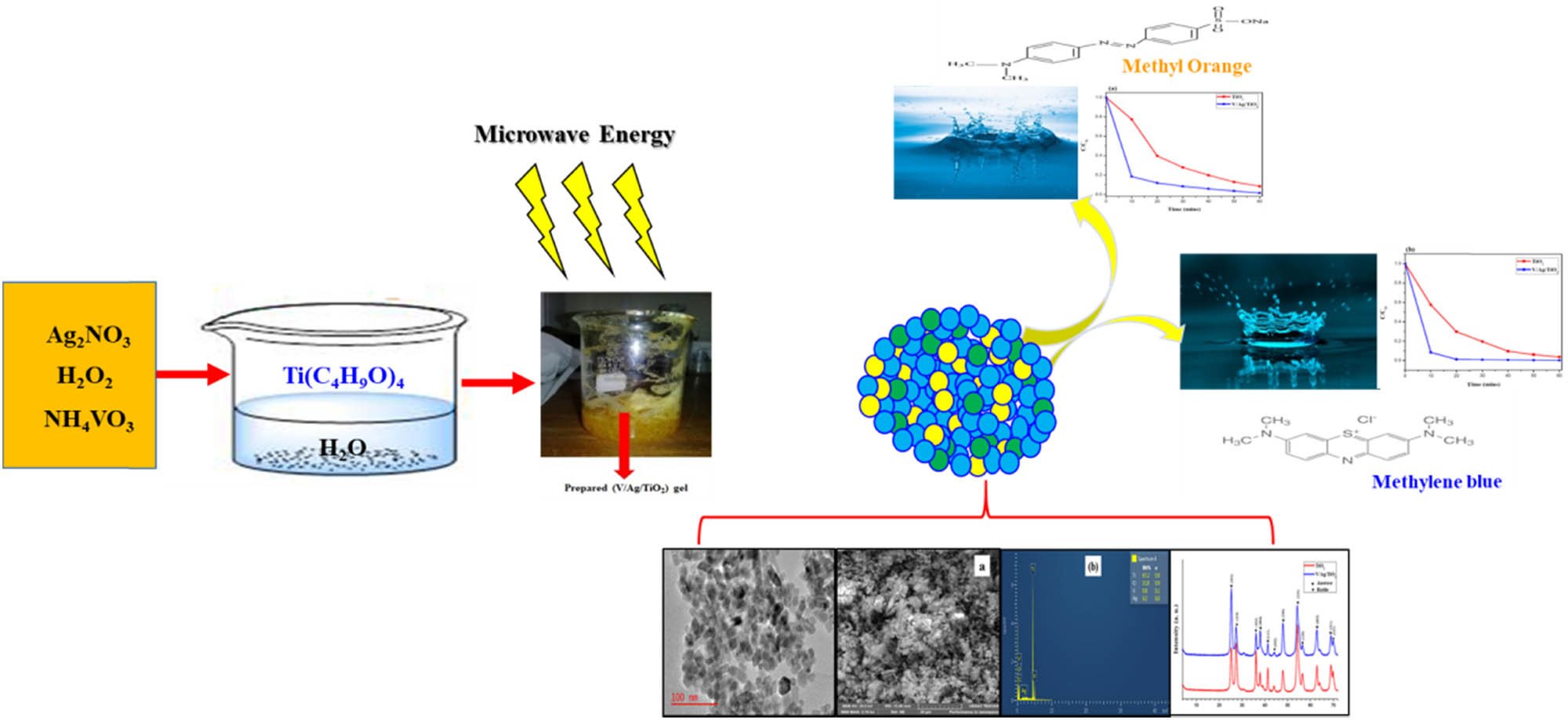 For this investigation, we aim to synthesized a ternary nanocatalyst and obtain small particles with a narrow size distribution in a short period of reaction time and high purity. Thus, a ternary nanocatalyst using titanium(iv) butoxide [Ti(C4H9O)4] as the titanium precursor and, ammonium metavanadate (NH4VO3) as the precursor of vanadium, and silver nitrate (Ag2NO3) as the silver precursor was synthesized using the microwave-assisted sol–gel method. The microstructural, chemical, photocatalytic, and optical features of the doped photocatalyst were investigated. For evaluation of the photocatalytic performance in degradation of organic pollutant, degradation of methyl orange (MO) and methylene blue (MB) as model pollutant with the use of visible light was examined. This innovation for microwave-assisted sol–gel synthesis of mixed metal hybrid nanocatalyst is for the development of a co-doped TiO2, with high purity, a short period of reaction time, and small particles with a narrow size distribution. This method will contribute to a faster, simplistic, environmentally friendly, and highly efficient method for the fabrication of high-performance next-generation nanocatalyst.
