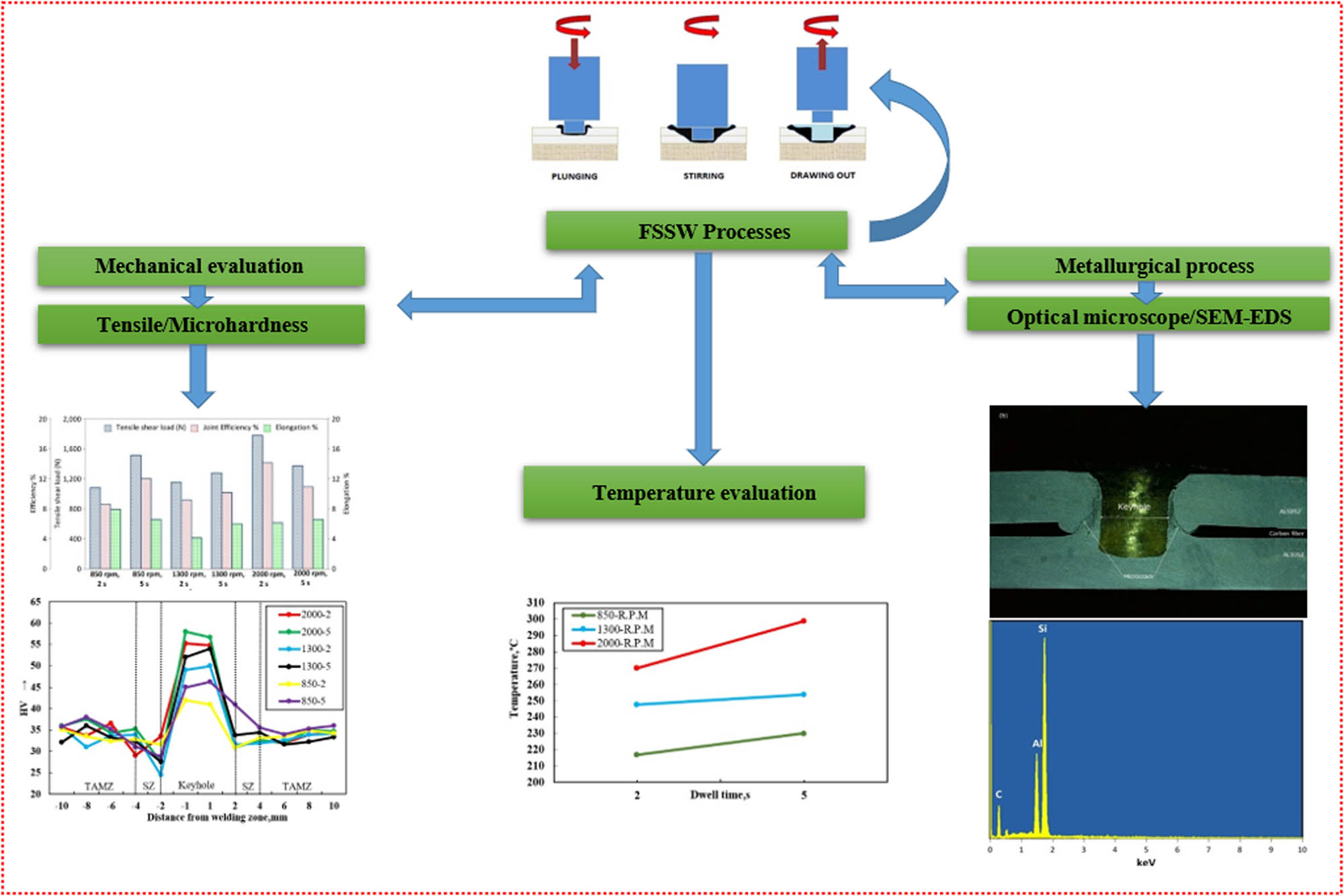 In the current study, the effect of welding parameters and CFRP interlayer on the mechanical and microstructural properties of welding joints has been investigated in FSSW joint process. The objective of this study is to evaluate the effect of CFRP interlayer on the performance of mechanical properties (tensile shear load and microhardness) and microstructural properties (SEM-EDS) and joint efficiency of the weld joints.