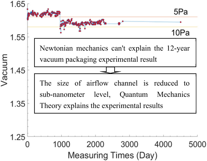 According to the thermal theory of Newtonian mechanics, when the gas components on both ends of a macroscopic channel are identical, the gas flow in the macro channel is driven by the differential pressure between the two sides of the channel. The pressure difference drives the gas flow until the pressure difference between the two sides of the channel is zero. However, our lab found that after 12 years, in the tube shell packaging experiments, the tube shell still maintains a high vacuum inside, which is inconsistent with the traditional theory, according to which the tube shell vacuum cannot be maintained for as long as 12 years. The prolonged holding of the vacuum indicates the hindrance of the gas flow in the channel.