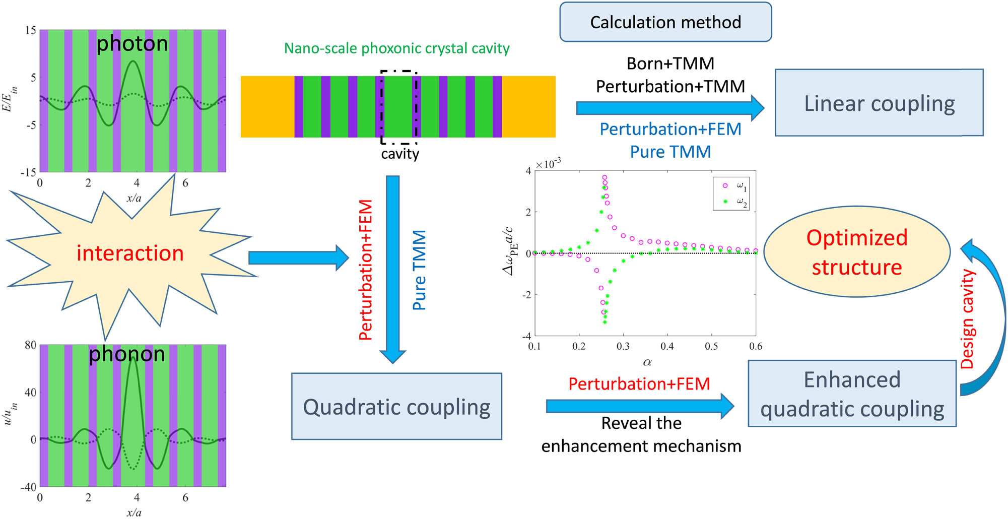 This study is organized as follows. In Section 2, we review the perturbation theory briefly and introduce the 1D PXC structure. In Section 3, four kinds of methods are applied to the calculation of linear and quadratic coupling, and the advantages and disadvantages of each method are then analyzed. In addition, some coupling laws are drawn for linear coupling and quadratic coupling. In Section 4, the enhancement mechanism of the quadratic coupling is further revealed. The structure with an optimal cavity is designed. The graphical abstract is also presented.