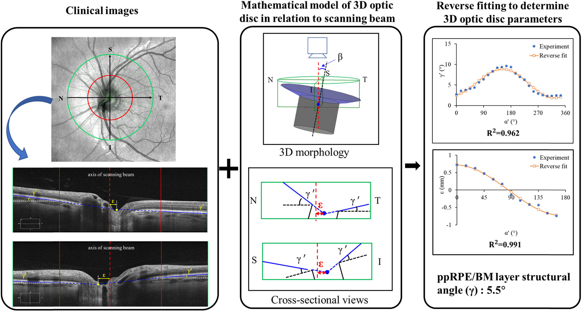 In this study, a mathematical model has been developed to delineate the relationship between the ppRPE/BM layer 3D morphology and its 2D cross-sections in various radial directions. It has been found out that the measured ppRPE/BM layer angle variation across the radial directions depends on the ppRPE/BM layer 3D angle and the scanning tilt angles, which could be calculated by reverse fitting the measured 2D data points in the radial OCT scans. This study provided a mechanistic understanding of the ppRPE/BM layer 3D morphology, which could be further exploited for the diagnosis and prevention of the ocular and neurological diseases [29,30]. Moreover, the computational framework could be applied to other biomedical studies that integrate different 2D observations into 3D representation [31,32,33].