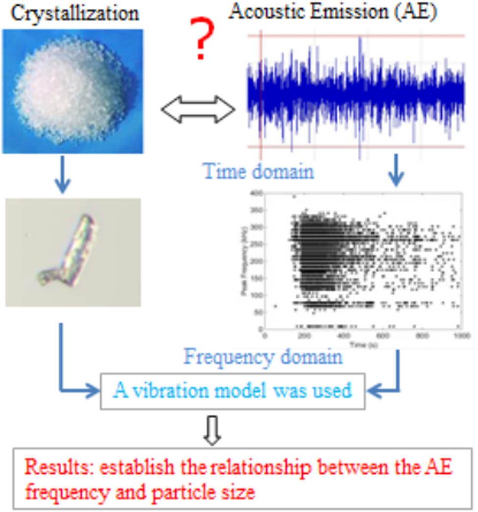 Based on the results of the previous experiment, this article studied the acoustic emission (AE) signals released during the crystallization of salicylic acid to establish the relationship between the AE signal and the particle size. A tremendous amount of acoustic data was analyzed using time–frequency domain analysis methods in order to extract the valuable contents. Based on the diffusion theory, the vibratory model between the AE signal and the crystal particle size was established. This article mainly studies the process of small particles diffusing to the growth point by impact, adding to the lattice, and the crystal releases energy. The impact of the growth unit on particle aggregate is equivalent to a linear elastic vibration system with one end fixed and the other end free. The vibration frequency is 200–355 kHz when the particle size is between 600 and 1,100 µm. The calculated vibration frequency is in good agreement with the measured frequency.