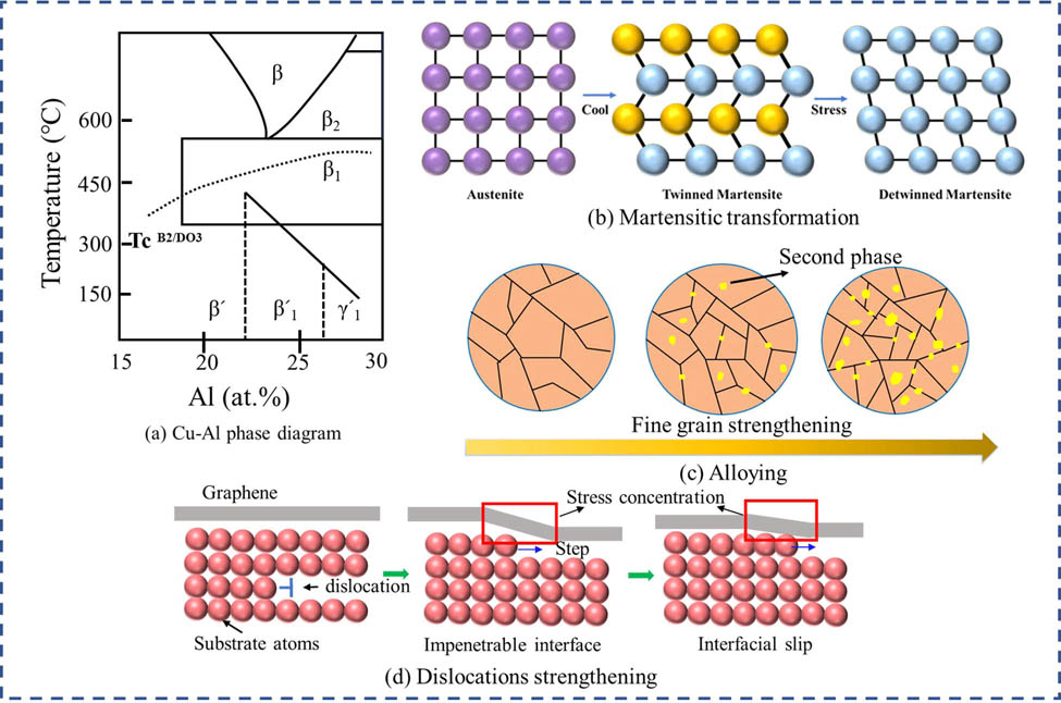 Therefore, in order to provide guidance for obtaining functionally and structurally integrated Cu–Al alloys with damping and mechanical properties, the efforts made by researchers to improve the comprehensive properties were in three aspects: alloying, heat treatment, and nanoreinforcement and are systematically reviewed. First, several common preparation methods are introduced. Suitable preparation methods are important to obtain materials with desirable properties. Then, the effects of alloying and heat treatment on the mechanical and damping properties of the alloys are summarized and analyzed, focusing on the microstructure, mechanical properties, MT characteristics, and damping properties. This article complements the studies of some researchers who have improved the damping and mechanical properties simultaneously from both alloying and heat treatment. In addition, the strengthening mechanism of the nanoenhanced phase is briefly described. Finally, the development of functionally and structurally integrated high-performance alloys from the perspective of 3D printing technology and numerical simulations is discussed and prospected. However, there are a few papers on the application of 3D printing and numerical simulation in Cu–Al-based alloys, so the specific discussion on this aspect in the prospective section is limited.