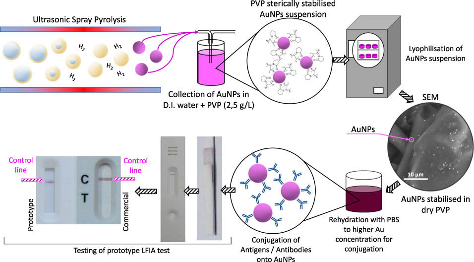 To monitor the progress and prevent the spread of the COVID-19 pandemic in real time and outside laboratories, it is essential to develop effective tests that can ensure rapid, selective, and reliable diagnosis of infected persons in different environments. Key in this regard is the lateral flow immunoassays (LFIAs) that can detect the presence of the SARS-CoV-2 virus quickly, with the aid of nanoparticles (NPs) and specific proteins. We report the use of gold (Au) NPs AuNPs synthesised from a gold(iii) chloride tetrahydrate precursor in a USP device and collected in a suspension composed of deionised water with polyvinylpyrrolidone as a stabiliser and cryoprotectant. In combination with freeze-drying of the AuNPs’ suspension to achieve water elimination, improved stability, and the target concentration, they exhibit the necessary properties for use as markers in LFIA rapid diagnostic tests. This was confirmed by complementary characterisation determined by using the techniques including inductively coupled plasma-optical emission spectrometry, dynamic light scattering method and zeta-potential, ultraviolet-visible spectroscopy, X-ray diffraction, scanning electron microscopy with energy dispersion spectrometer, and transmission electron microscopy, as well as with the preparation of a prototype LFIA test strip with AuNPs. Thus, such AuNPs, as well as the USP method, show promise for the development of new markers for use in LFIA.