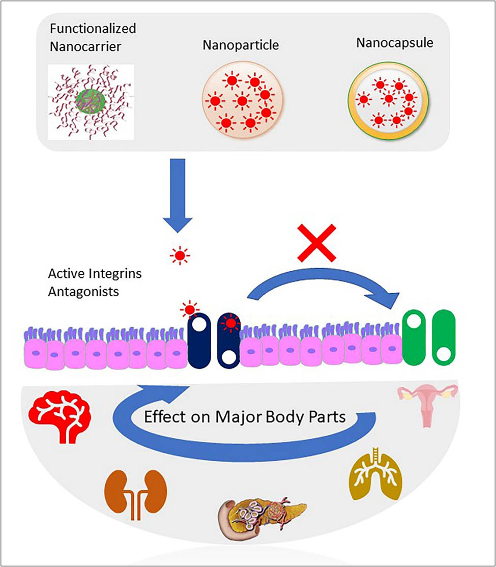Significant knowledge about the role of integrins in various pathological and physiological conditions led to the invention of various therapeutic agents. The nano-sized formulated ανβ3 antagonist drugs certainly play an important role in several biological activities in therapeutically relevant pathways, which needs further and deeper studies, to pinpoint ανβ3 inhibition targets. The Tetrac model is an initiating point in developing ανβ3 antagonist drugs as nano modalities that might form part of the combination therapy as an anticancer agent. Opportunities for other cross-reactive and closely related thyrointegrin antagonists may also be searched to lead the design of newer and specifically targeted new chemical entities at specific locations in the receptor. Efforts to design and develop new chemical entities fitting the receptor binding site, and pharmacophore-based model products exists which could be transformed in future into nanostructural motifs, and conjugates of a plethora of biodegradable and biocompatible polymers of natural, synthetic, and semi-synthetic origins.