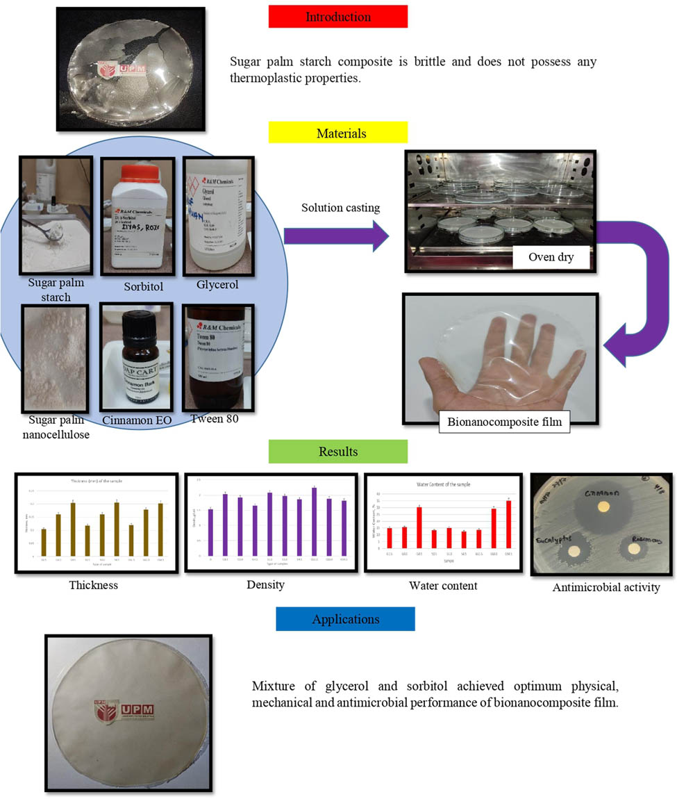 Responding to this problem, various research groups and industrial organizations around the world are presently working on new eco-friendly packaging solutions that take advantage of biopolymer’s “ecological” benefits in applications such as food packaging [11]. New materials made from renewable resources have exploded in popularity during the last decade [12]. Most of the research focused on polysaccharides, proteins, and lipids to be used in edible films. The technological properties could be improved via chemical reactions (e.g. cross-linking) or physical treatments (e.g. ultrasound, heat, or radiation) to change their molecular structures [13,14]. Various studies confirmed the growing interest in the utilization of starch derived from numerous sources incorporated with essential oils (EOs) to prepare biobased packaging films. The rigidity of bionanocomposite films is contributed by the strong interactions between amylose–amylopectin or amylose–amylose in the polymer matrix [15,16,17,18]. By adding a plasticizer, these films’ inherent brittleness and rigidity are reduced, while their malleability, ductility, and flexibility are increased. In literature studies, the addition of nanofillers into a biopolymer matrix led to an improvement in the properties of biopolymer-based packaging films including enhanced mechanical, thermal, barrier, and physicochemical properties [19,20,21]. On the other hand, it is not very common to study the effect of the plasticizer type and concentration on the films of sugar palm nanocellulose reinforced sugar palm starch (SPS)/cinnamon essential oil (CEO) bionanocomposite films. Recent studies by Ilyas et al. [13], Syafiq et al. [1], and Sanyang et al. [7] have highlighted the sugar palm tree as a promising source of starch for biopolymer use. Sugar palm (Arenga pinnata), a versatile tree, is native to many tropical countries, most notably South-East Asia. The tree is well-known for its various economic applications [22,23,24]. Additionally, starch can be collected from the trunk of the tree, especially when the tree no longer produced fruits and sugar [25]. Traditionally, SPS is utilized as a feedstock for materials [26]. According to Ilyas et al. [27] and Nazrin et al. [28], SPS film containing 0.5% sugar palm nanocellulose revealed improved tensile strength of 140% [27] and water vapour permeability of 19.94% [28]. Nevertheless, it still has not gained the attention it requires to be developed as an industrial starch biopolymer. Starch is regarded among the most promising biopolymers owing to their benefits, e.g. renewability, biodegradability, low cost, and abundant availability [1,7,29,30]. Starch is also the primary source of carbohydrates in tuber and cereal plants, e.g. cassava and corn, respectively, comprising two macromolecules, which are amylose and amylopectin. It is extensively used to develop biodegradable film due to the advantages it offers, e.g. affordability, availability, and excellent film-forming ability [31,32]. The proportion of linear homopolymer amylose to highly branched amylopectin is dependent on the plant starch source and could influence their processing behaviour and final product characteristics [7].