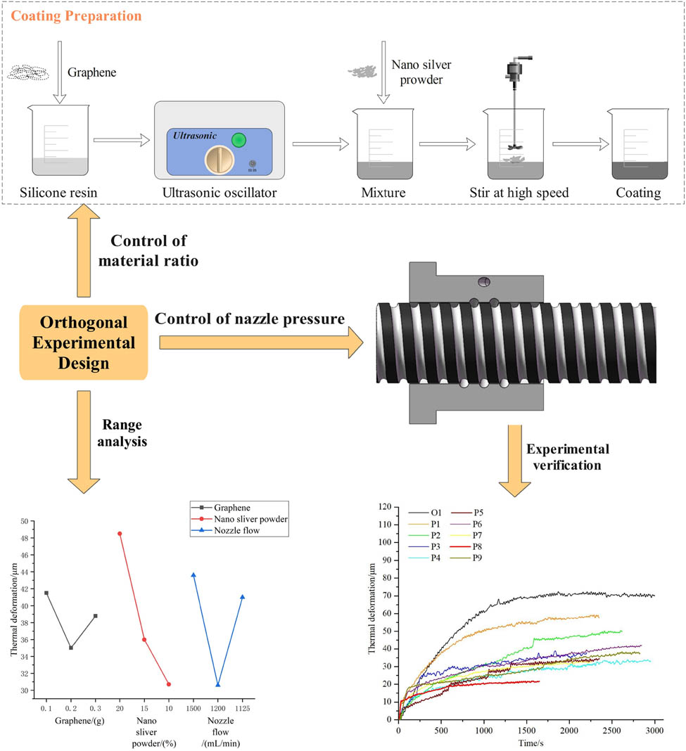 In terms of thermal deformation reduction of the ball screw, nano coatings were considered as an effective technical approach. In this study, a parameters optimization method of nano coating was conducted. The effect of material ratio and spraying process on nano coating thermal performance was discussed. Herein orthogonal experiment was carried out on self-design ball screw bench to obtain the coating with optimal material ratio and spraying process, which had better performance in reducing the temperature rise and thermal deformation. A schematic representation of the study is shown in graphical abstract.