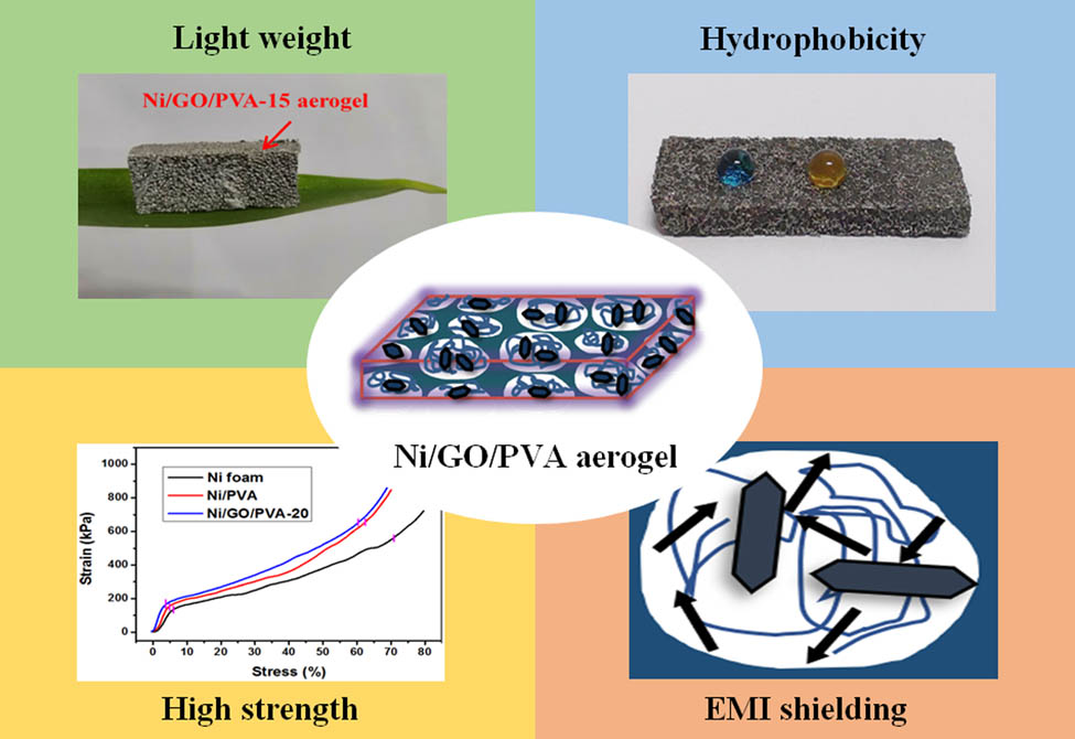 From graphical abstract, we successfully designed and fabricated Ni/GO/PVA aerogels by freeze-drying process, which possess lightweight, hydrophobicity, high compression strength, and superior EMI shielding performance. The GO in aerogel was dispersed in PVA, which greatly increased the heterogeneous contact area and enhanced the interfacial polarization effect. The porous structure makes the electromagnetic wave be reflected and scattered many times, which increases the propagation distance of the electromagnetic wave. Combined with Ni foam with high conductivity and permeability, reflecting the large number of incoming electromagnetic waves, the synergistic effect of dielectric and magnetic loss improves the EMI SE of the materials. In addition, the hydrogen bonding between GO and PVA improves the mechanical properties of the material. The surface energy of the material after hydrophobic treatment is low, and the droplets can roll on the surface, which realizes the self-cleaning function and improves the corrosion resistance. This design and fabrication strategy provides high-potential for the practical application of EMI shielding materials.