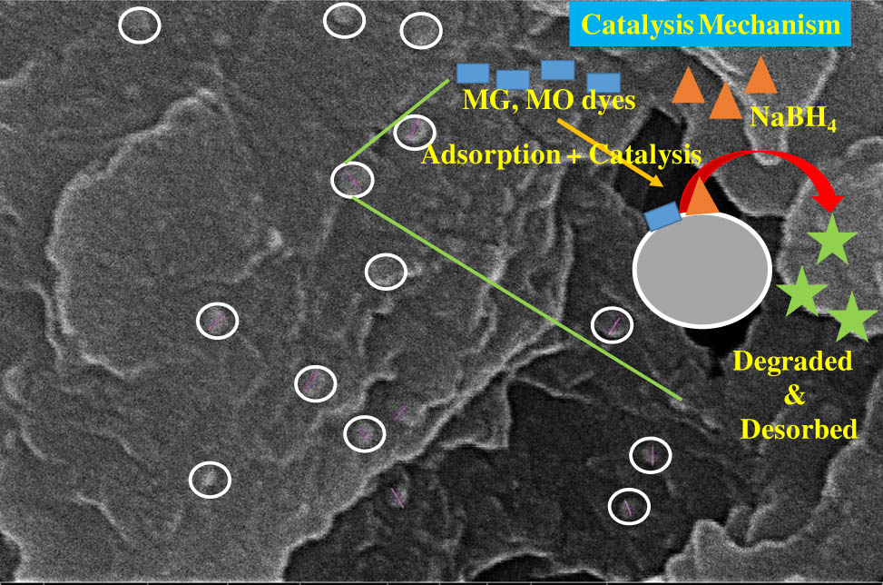 The synthesis of Na-Alg stabilized AgSr NPs has been achieved followed by evaluation of their morphological features. According to FE-SEM observations, NPs were obtained orthorhombic crystal phase and the particle size ranged from 18 to 32 nm without significant agglomeration. These spherical-shaped NPs were found to have outstanding catalytic potential for the degradation of MO and MG dyes in aqueous media. The catalytic potential of NPs in the presence of NaBH4 was monitored and the results have proven that NPs own remarkable catalytic properties to remove carcinogenic dyes from wastewater and can be used as a water cleanser tool in the future against different organic pollutants. Researchers have extended their spectrum of studies toward developing novel composite materials and their applications in environmental remediation. In the future, the fabrication of a new combination of biopolymer-supported metal NPs can be achieved followed by utilizing these composites for environmental, biomedical, and energy storage applications.