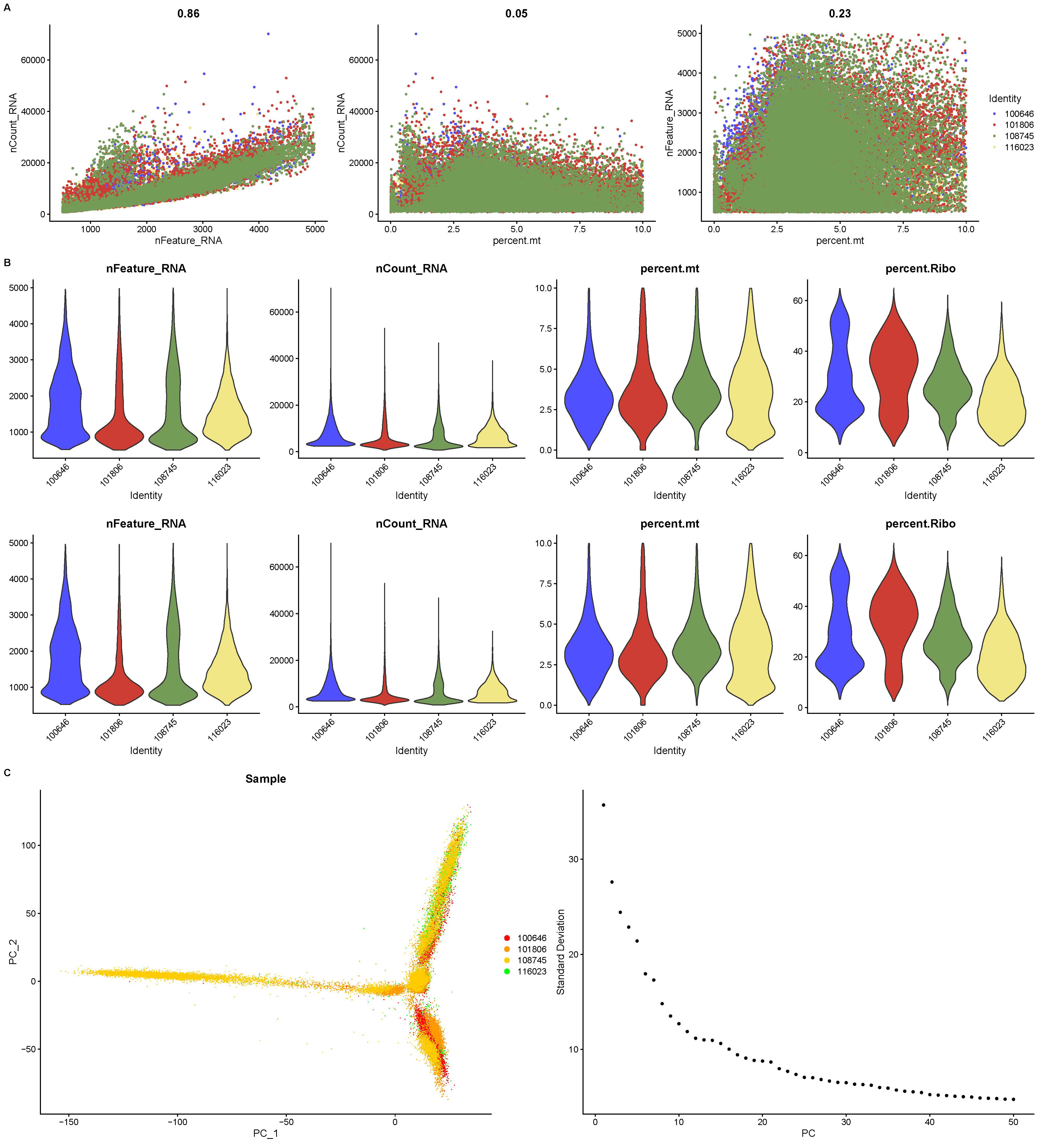 Data filtering and quality control were used to extract high-quality single-cell data. Under stringent filtering criteria, each gene was required to be expressed in at least 3 cells and each cell expressed a minimum of 250 genes. Subsequently, the correlation between unique molecular identifiers (UMIs)/mRNA ratio and mitochondrial gene content was evaluated to prevent significant impacts of mitochondrial gene expression on the overall analysis of cellular transcriptomes. The proportion of mitochondrial and rRNA genes in each cell was quantified by the PercentageFeatureSet function [19] in the ‘Seurat’ R package (version 5.0.3), ensuring that cells expressed gene numbers between 500 and 5,000 genes with less than 10 % mitochondrial gene content and non-normal cells were excluded. To enhance the purity and accuracy of the dataset, the ‘DoubletFinder’ R package (version 2.0.4) [20] was applied to identify and remove double cells. Next, data from the four samples in GSE253013 were standardized using the SCTransform function in the ‘Seurat’ package (version 5.0.3) [19], and batch effects were removed using the Harmony algorithm [21].