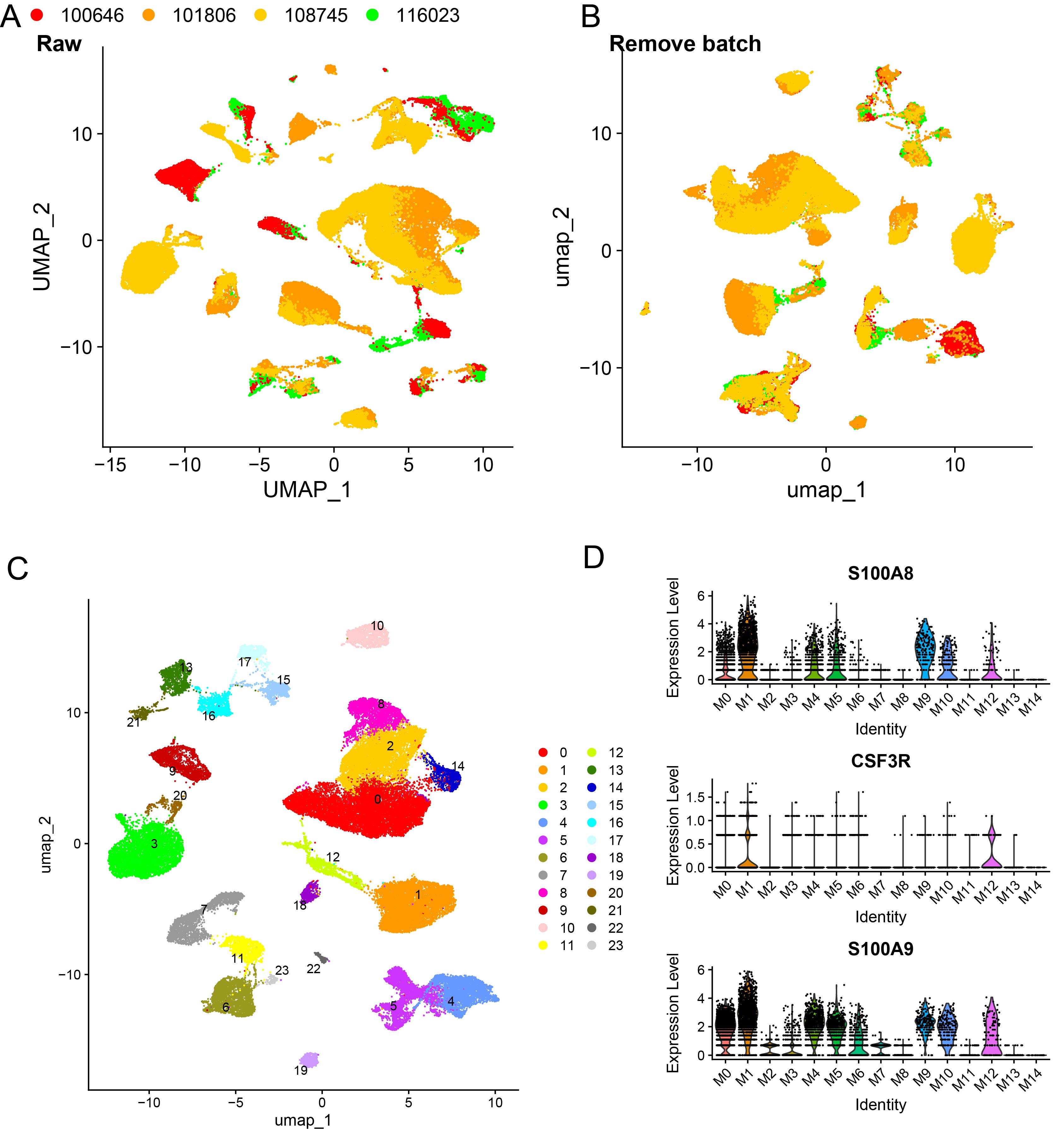 After filtering and quality control of the obtained data, we successfully merged a dataset containing 54,301 high-quality cells. Correlation analysis revealed a significant correlation between UMI and mRNAs, while the UMI/mRNA ratio was not significantly correlated with the content of mitochondrial genes, indicating that mitochondrial genes did not significantly affect the results of the current study (Supplementary Figure S1A). Additionally, the violin plots of the cell quality before and after filtering and quality control (Supplementary Figure S1B) showed significant improvement in the data quality. The results of PCA dimensionality reduction are displayed in Supplementary Figure S1C. Data from the single-cell samples were normalized and standardized (Supplementary Figure S2A, B). After dimensionality reduction and clustering, a total of 24 cellular subsets were identified (Supplementary Figure S2C). In particular, neutrophils were annotated using known marker genes S100A8, S100A9, and CSF3R (Supplementary Figure S2D).