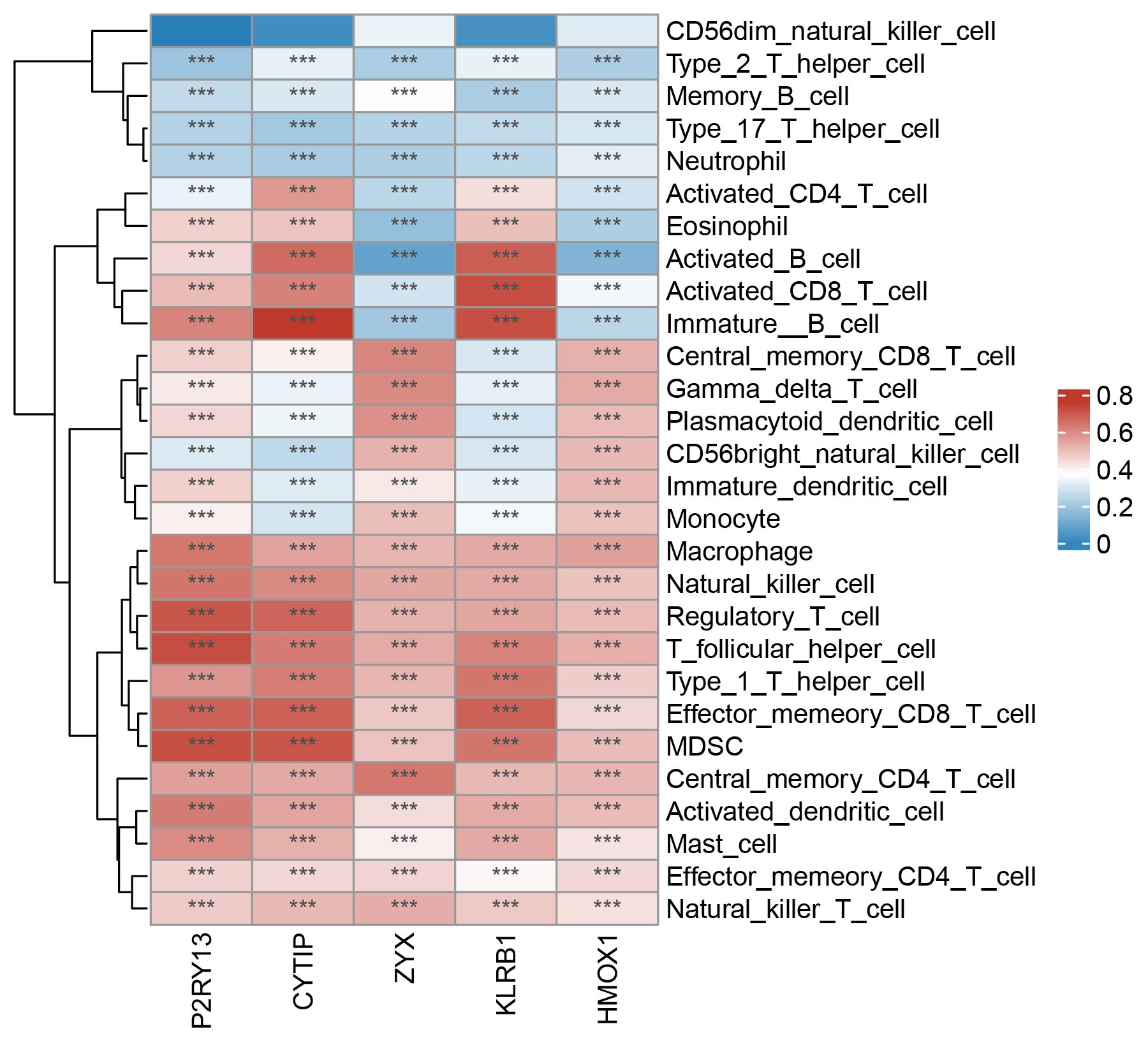 To further optimize the selection of key genes, we analyzed the proportion of these 15 genes in the three GO terms and the top 5 genes (P2RY13, CYTIP, ZYX, KLRB1, and HMOX1) with the most significant functions were considered as potential biomarkers for LUAD (Figure 5H). Additionally, we examined the association between the five key neutrophil-related genes and immune cells in the TME of LUAD by applying the ssGSEA algorithm. As shown in Supplementary Figure S7, significant associations were observed between all 5 genes and most immune cells (e.g., mast cells, regulatory T cells, macrophages, etc.).