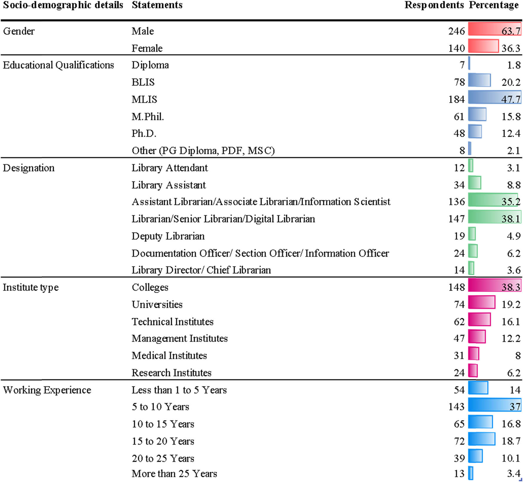 Table 1 presents an overview of the socio-demographic characteristics of library professionals in India. The findings show that the library profession in India is male dominated; Brown argues that using AI in libraries does not have many gender issues (Chen et al., 2021). For instance, chatbots have been given typically feminine names, appearances, voices, and even personalities, giving the impression of a future in which technology design will take a more feminist and gender-inclusive approach and move away from the patriarchal inclinations in designing digital assistants as women (Johnson, 2018).