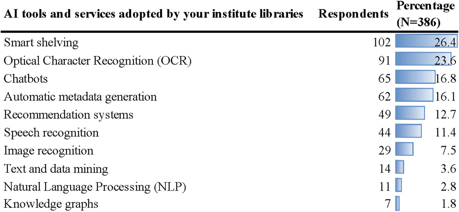 Table 6 presents an overview of AI tools and services currently used within Indian libraries. The respondents believed various AI tools and services must be used to implement smart libraries (Bi et al., 2022). According to the respondents, the most adopted tool is smart shelving, which uses RFID and other tracking technologies in conjunction with AI algorithms to automatically track the location and movement of library resources field (Chen et al., 2021). The respondents also indicated that other adopted tools, including OCR, automatic metadata generation, recommendation systems, speech recognition, and image recognition with NLP and knowledge graphs, were less commonly adopted (Bi et al., 2022).