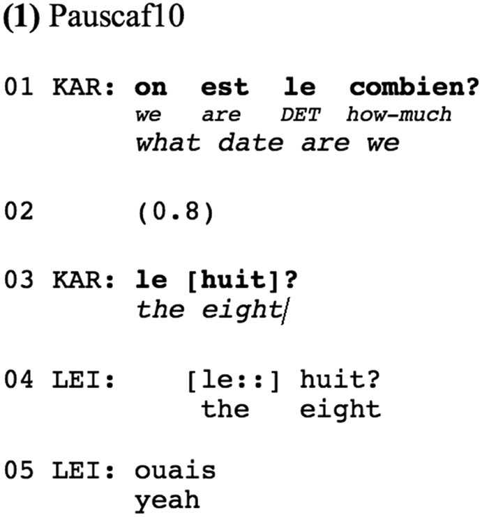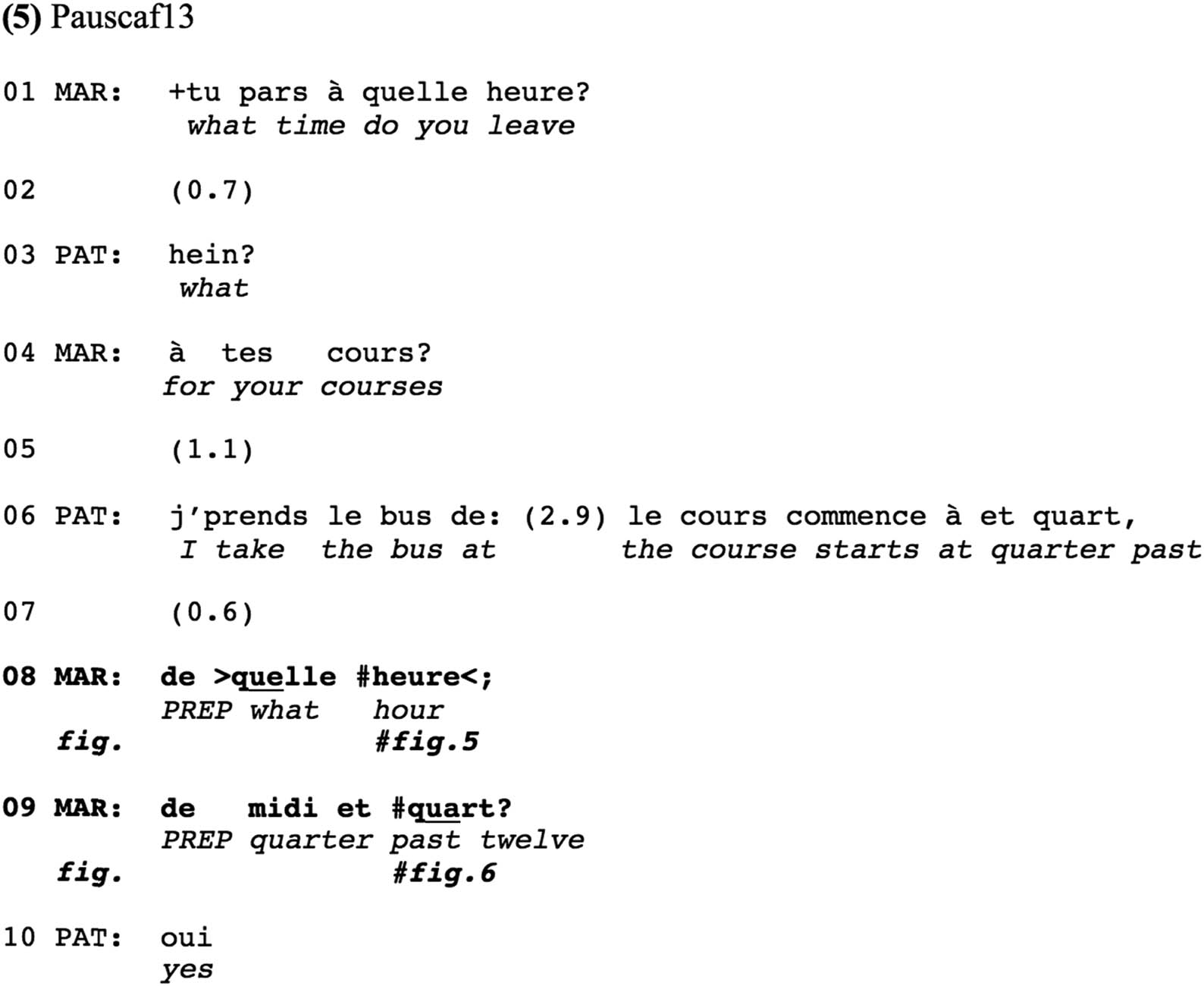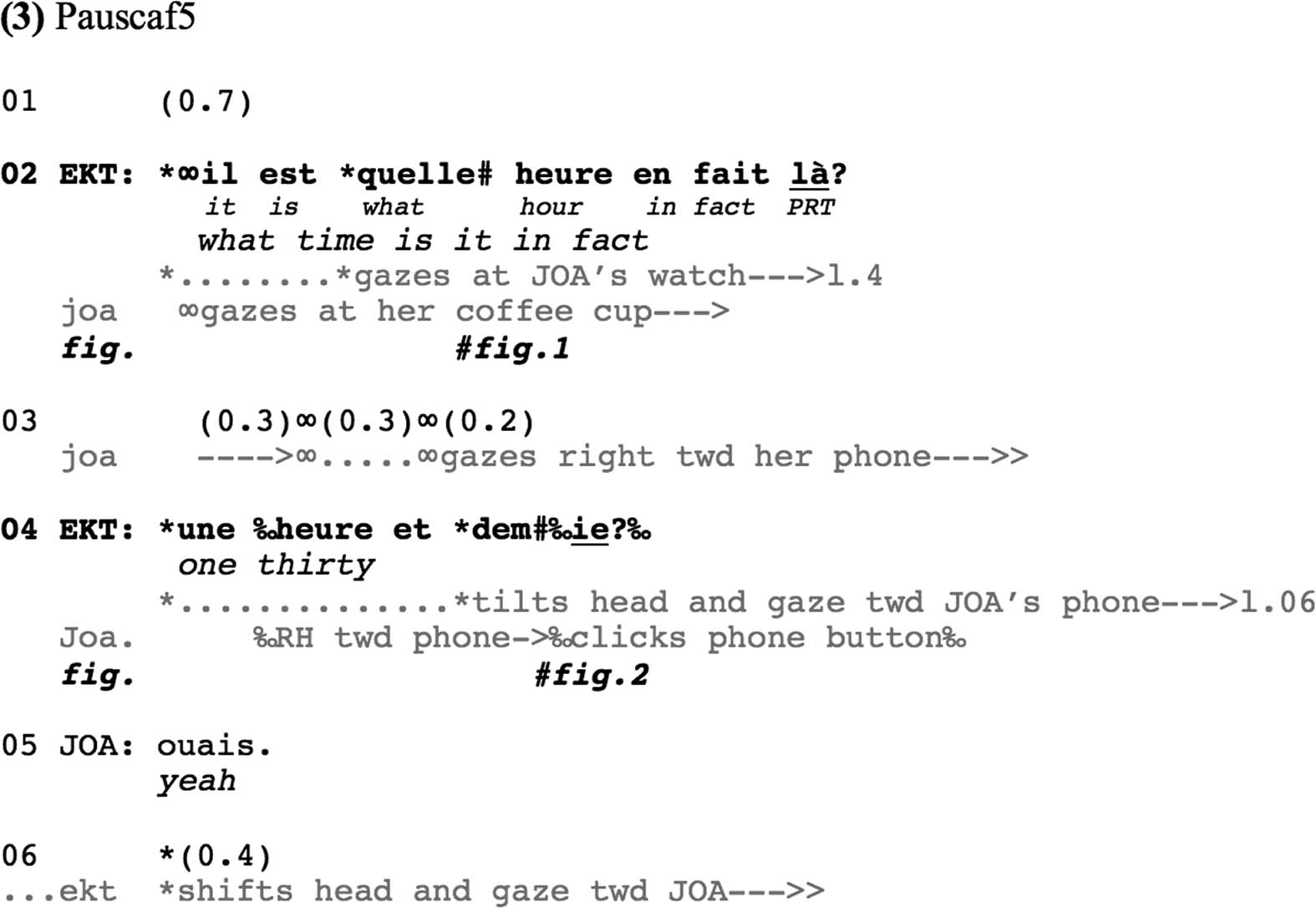 Ekta’s QWQ (l. 02) is met with a lack of recipient response (l. 03), upon which Ekta extends her turn with the phrase une heure et demi ‘one thirty’ (l. 04). Prosodically, both the initial question and the turn extension are delivered as independent units, each carrying its own focal accent and ending on final (high-rising) intonation, with clear cessation of articulation between the two. Consisting only of a phrase, it is by virtue of the second unit’s occurrence after the first that it can be heard as implementing a question (a PQ: “[is it] one thirty?”). Sequentially, the second unit is produced in response to recipient lack of uptake (l. 02), and praxeologically, it offers a candidate answer to the just-produced question, marked as a “try” by rising intonation (l. 04; Sacks and Schegloff 1979), thereby inviting confirmation from the recipient. Joana’s confirming response is delivered immediately thereafter (l. 05) and is formally fitted to the PQ (Raymond 2003): It treats Ekta’s turn-extension (l. 04) as seeking confirmation.