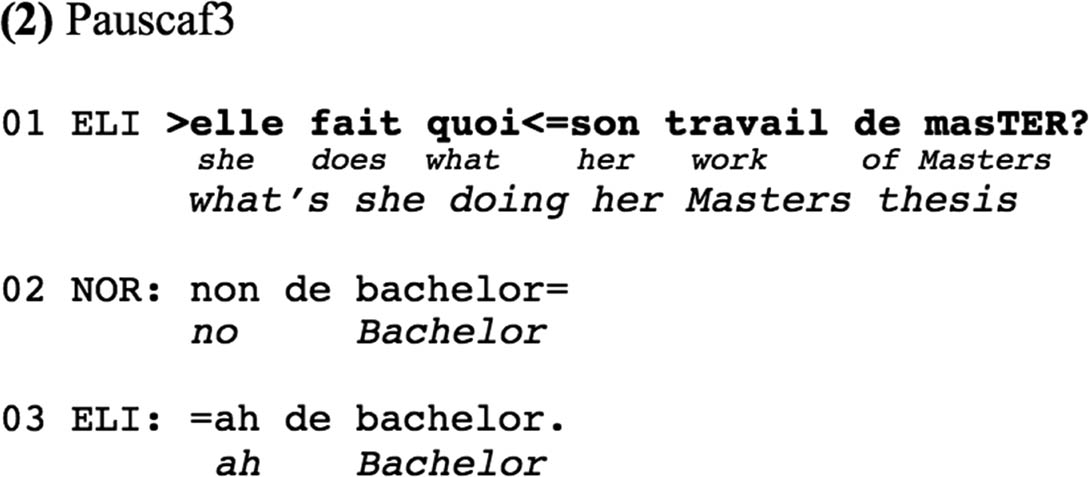 In (2), the speed-up of tempo on the segment elle fait quoi ‘what’s she doing’, the continued pitch (lack of pitch up/down-step) as well as the continuing voicing between the two segments – and hence latching (Schegloff 2000) of the second onto the first – present the whole stretch of talk in line 1 as a single unit, ending on final intonation; furthermore, the quoi ‘what’ does not carry any phonetic exponents of finality (such as nuclear accent in French, Delattre 1966, Persson 2014). Through all these features, the second segment, though syntactically separate, is prosodically tightly integrated with the first. The whole stretch of talk represents one complex construction grammatically configured as [QWQ + phrase], which is treated as a PQ by the recipient (l. 02), who provides a “no” response and then adds the alternative “bachelor”. Although lexico-syntactically, the turn is built in ways that mirror the QWQ plus candidate answer in (1), here the whole stretch implements one single action.