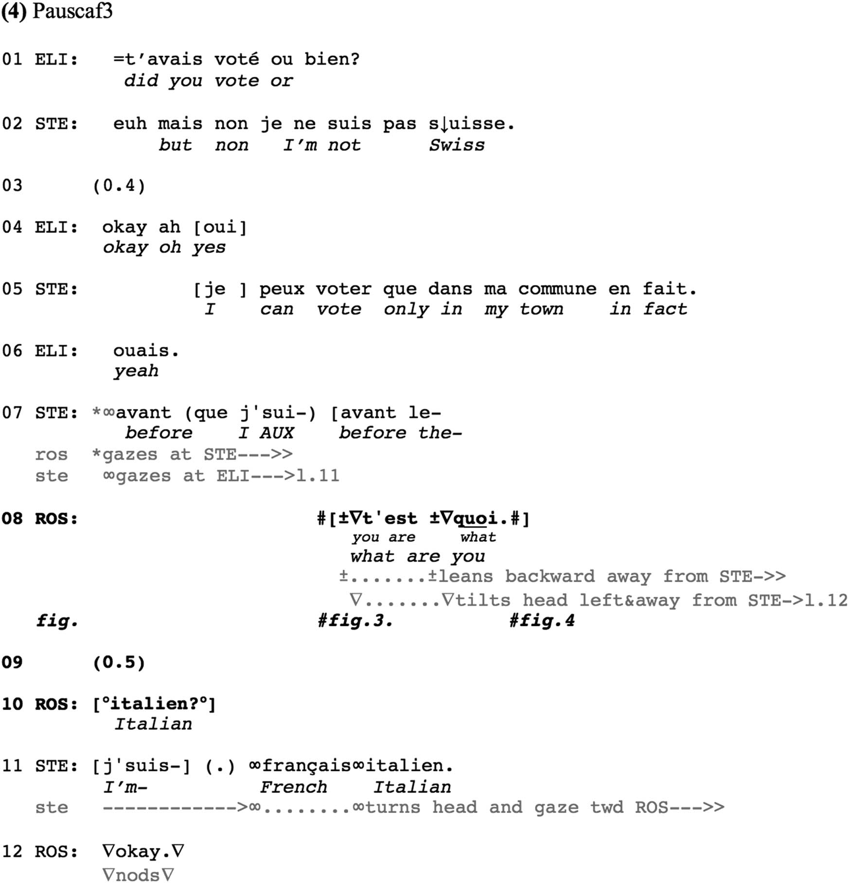 A second example is shown in (4), taken from a conversation between Stephan, Rosa, and Eliot (Eliot is on the right, off the captures, Figures 3 and 4). Eliot inquires whether Stephan voted in last weekend’s popular vote, to which Stephan replies that he did not because he is not Swiss by nationality (l. 02) and therefore can vote only at the communal level (l. 05). Rosa’s question (l. 08) comes in overlap with Stephan’s turn-extension (l. 07).