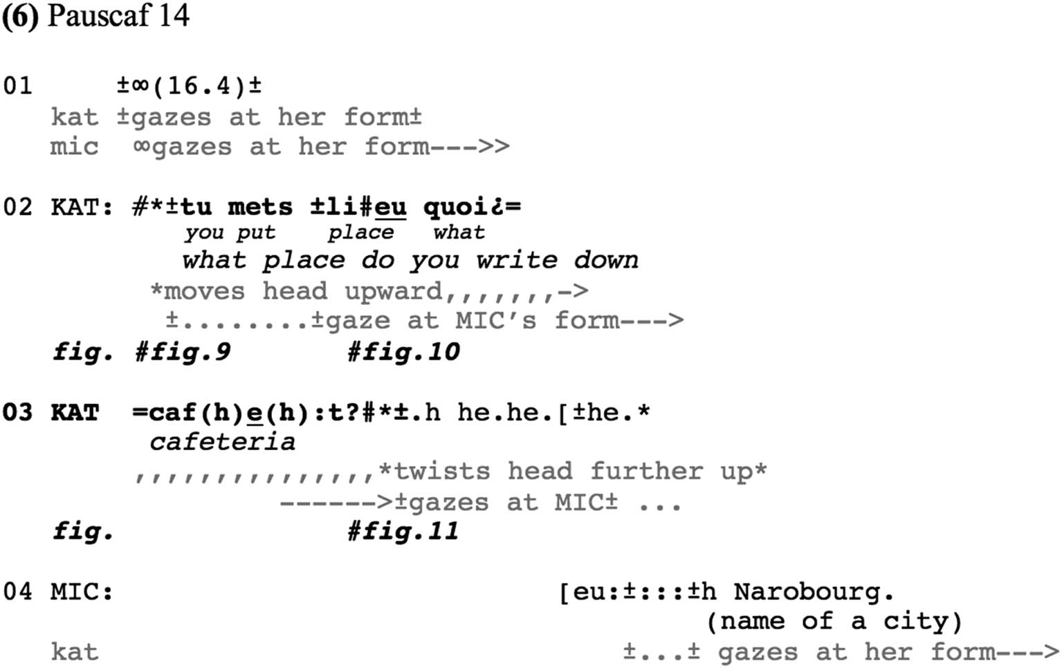 This, too, is a case of what Barth-Weingarten (2016), suggesting the notion of “cesuring”, highlights as being part of a continuum of prosodic integration: The fuzziness is due to the varying degrees to which the relevant cesuring parameters (pitch, tempo, volume, etc.) change, indicating stronger or weaker boundaries (“cesuras”) between candidate units (see also Barth-Weingarten and Ogden in this SI). Here, the presence of a focal accent in each of the segments (on lieu and on caf(h)e(h):t, respectively) cues them as two distinct prosodic units, yet the only very slight rise on quoi at the end of the first segment (l. 02) with no further pitch movement to the second establishes a notably weak pitch boundary between them. The impression of tight integration is further enhanced by the latching of caf(h)e(h):t to quoi – a resource through which speakers hold the turn past a TRP (Schegloff 2000) and minimize the set of cesuring features in that there is no final lengthening, for instance. The questioner hence here again actively works to eliminate a sequential slot that was projected syntactically and praxeologically, by means of the QWQ, for her recipient to take the turn, and instead adds her own candidate answer to the question.