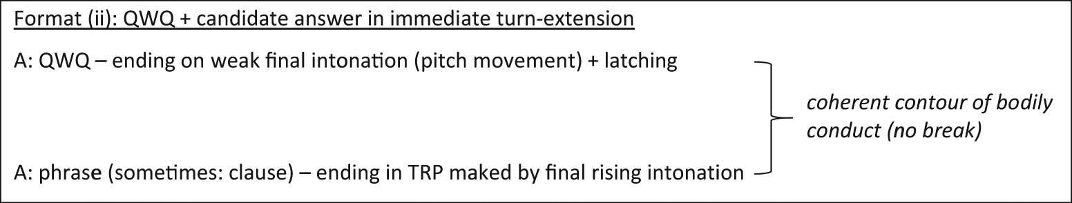 In sum, format (ii) groups together cases in which no gap occurs in between the potential units, and these are prosodically integrated to a lesser (ex. 5) or greater (ex. 6) extent. While the two parts still carry their own focal accent and exhibit some unit-final pitch movement, the latter is only small and they are audibly connected by latchings, thereby displaying a more or less weak boundary between them, so that their unit-ness becomes questionable. Format (ii), which represents 31% (n = 15) of the [QWQ + phrase/clause] pattern found in the data, schematically runs as follows: