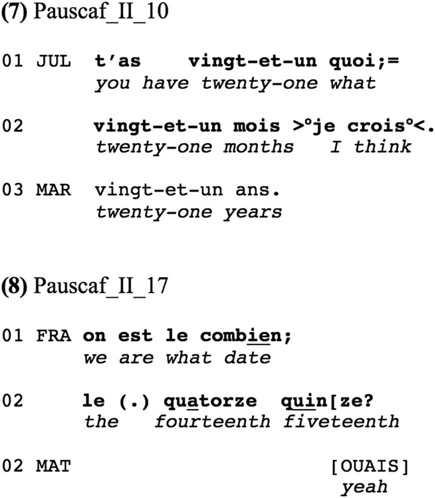 In some cases in the data, the second part in this format does not consist of a phrase but of a short clause that recycles the subject and the verb from the QWQ segment, so that the only “new” information that part conveys is again via a phrase (here: le huit ‘the eight’):