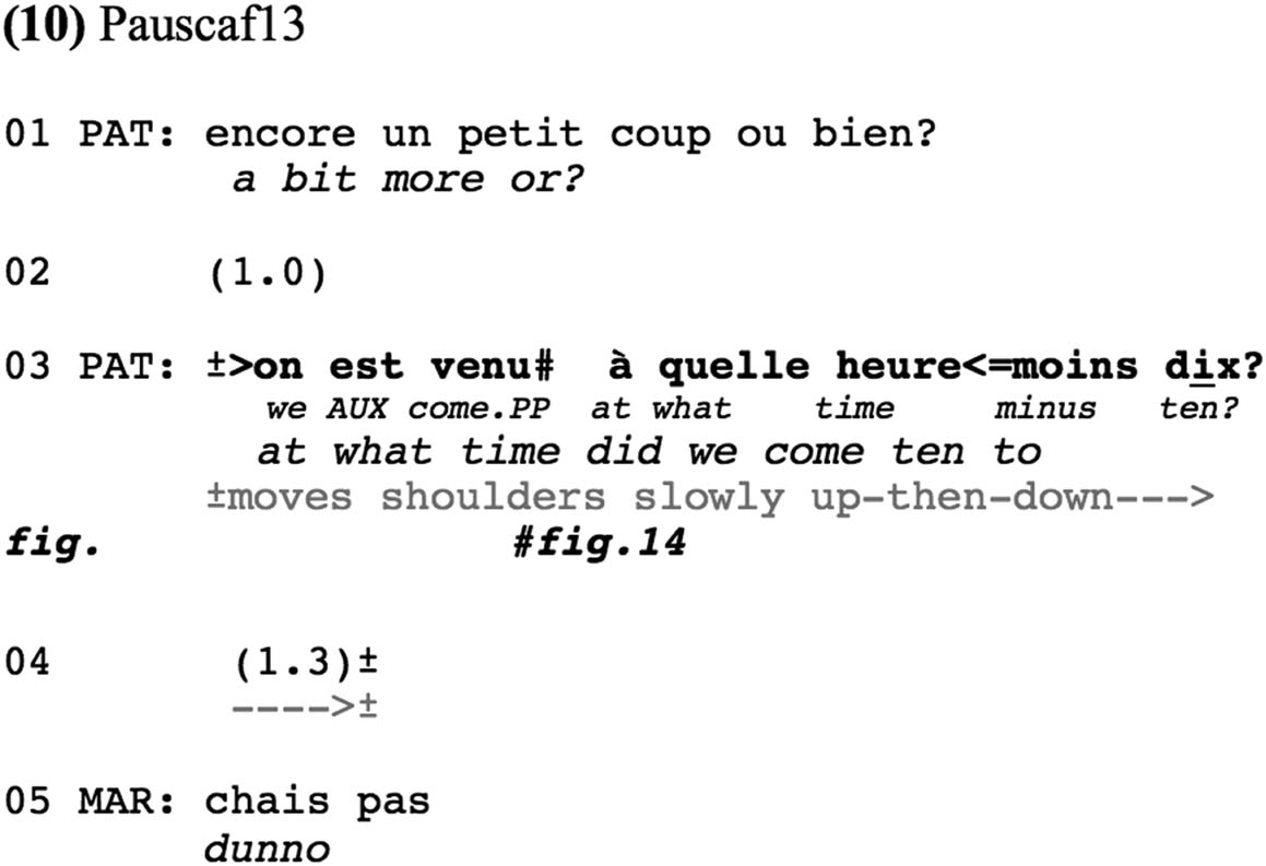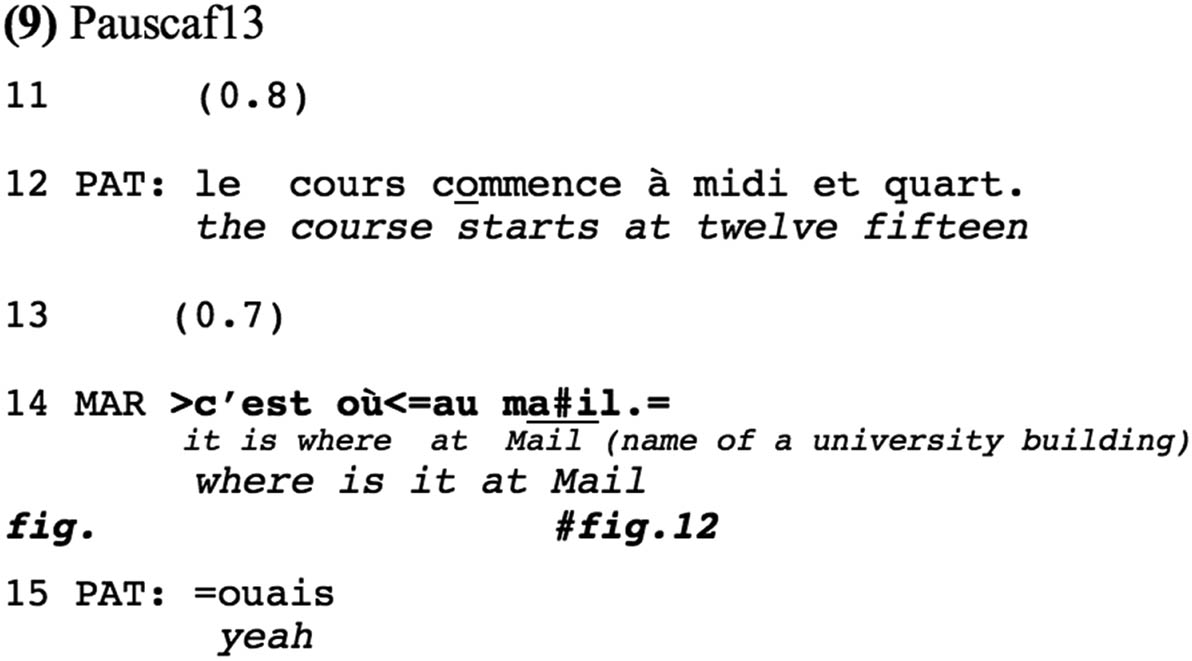 Moreover, throughout the segment Marie steadily gazes at Pat, without moving, while Pat’s gaze is averted (Figure 12). Pat’s response (l. 15) unmistakably treats Marie’s turn as offering a PQ rather than a QWQ: his ouais “yeah” is type-conforming and it is doing confirmation.