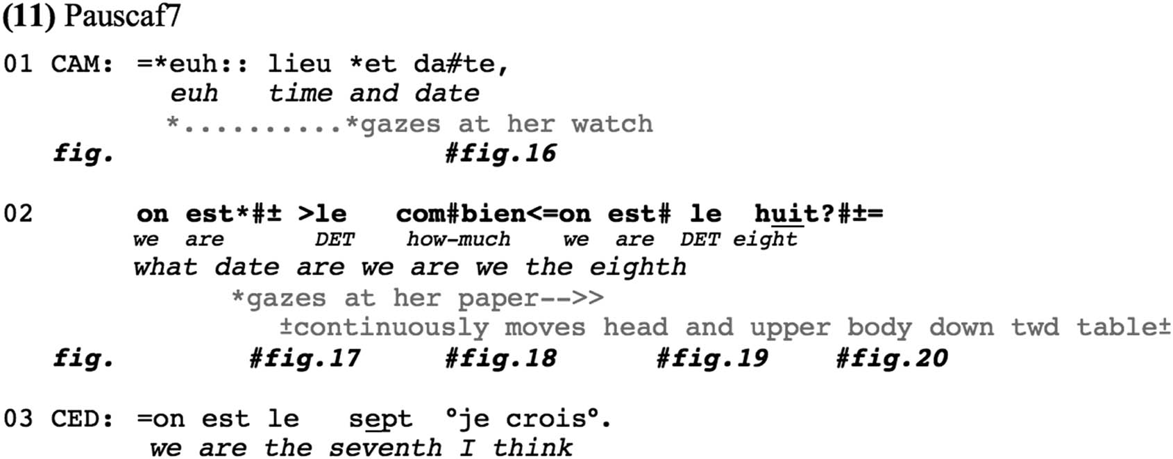Again we have speed-up of tempo on the (end of the) first segment, latching of the second onto the first, a single nuclear accent (on huit), and a coherent prosodic contour that packages the two as one single intonation unit. Interestingly, the second unit being clausal in nature, the prosody here unites two syntactically independent clauses under one single contour. The speaker, Camille, deploys again a coherent bodily movement, which consists of slowly but steadily lowering her head toward her paper with her gaze fixed on it (Figures 17–20), and this dynamic movement is deployed exactly synchronously with the whole question turn (l. 02), contrasting with her preceding gaze at her watch with her head still (Figure 16, l. 01).