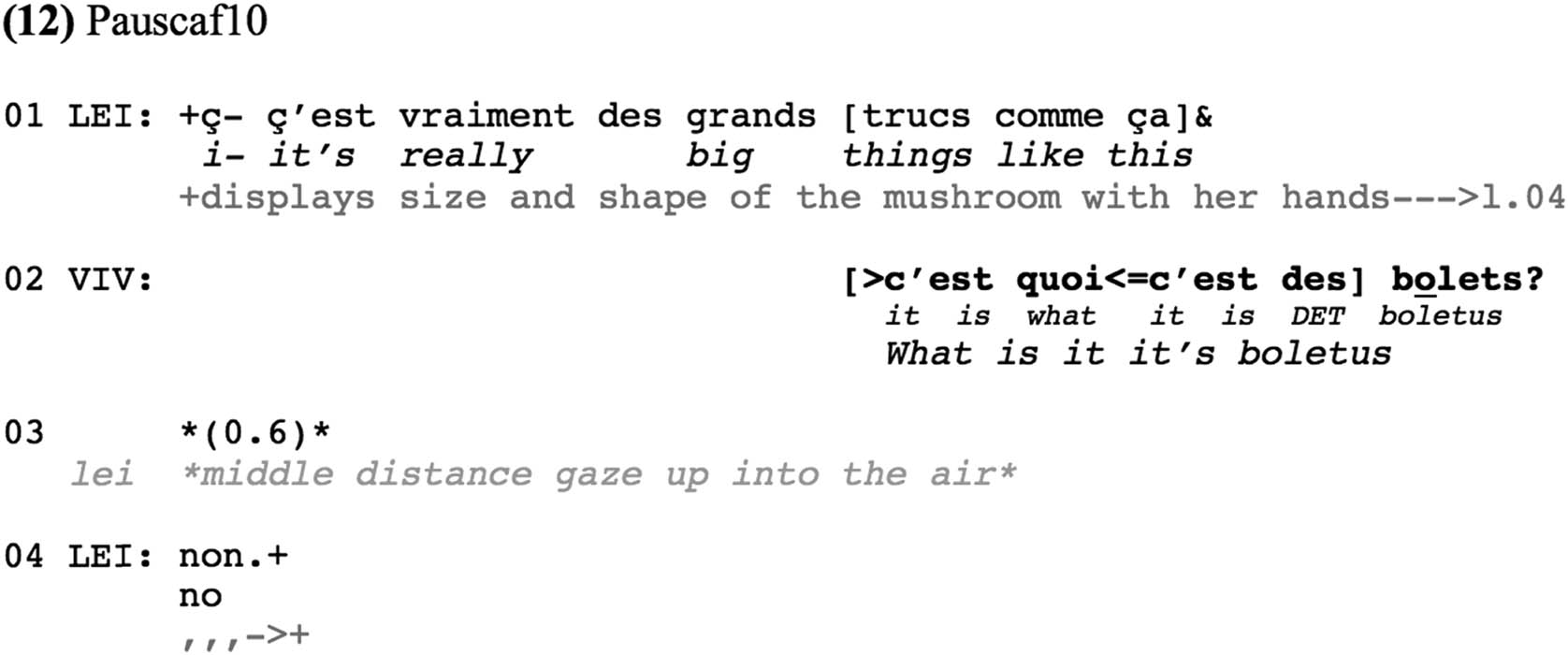 Vivi offers a tentative guess (l. 02) as to the nature of the mushroom, which is then disconfirmed by Leila’s straightforward “non”, though it is produced with a slight delay during which Leila displays cognitive search (l.03, she deploys an “out of focus ‘middle-distance’ look” (Goodwin 1987, 117).