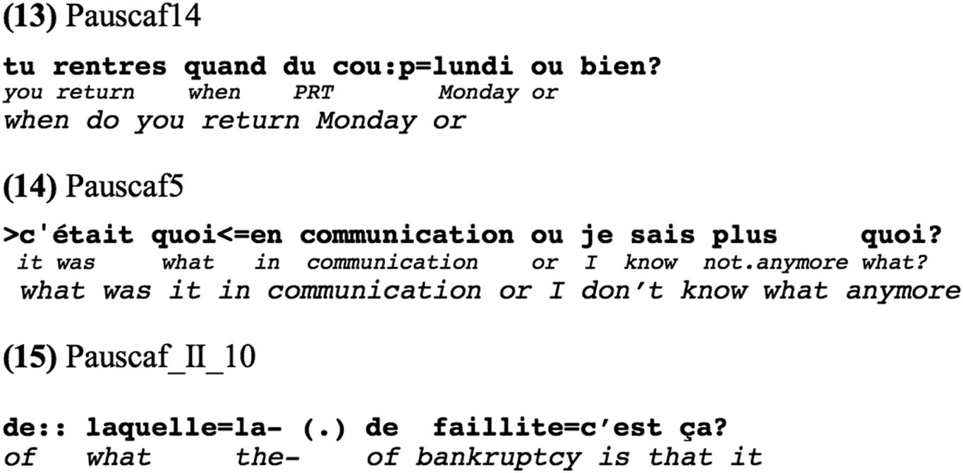 Just like in pattern (ii), speakers may further enhance the tentative character of their guess by ending their turn with ou bien ‘or’, an epistemic downgrade or a tag-like element (ex. 13–15):