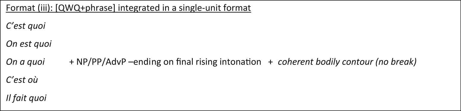 The very existence of a continuum in strength of boundary marking in the target pattern may suggest a cline of routinization of the pattern between two and one unit, i.e., it may be symptomatic of an ongoing sedimentation of [QWQ + phrase/clause] into a single-unit format as a routinized grammatical resource for venturing a tentative guess. This is what we turn to in the next section, which documents an important degree of lexico-syntactic consistency of the single-unit format.