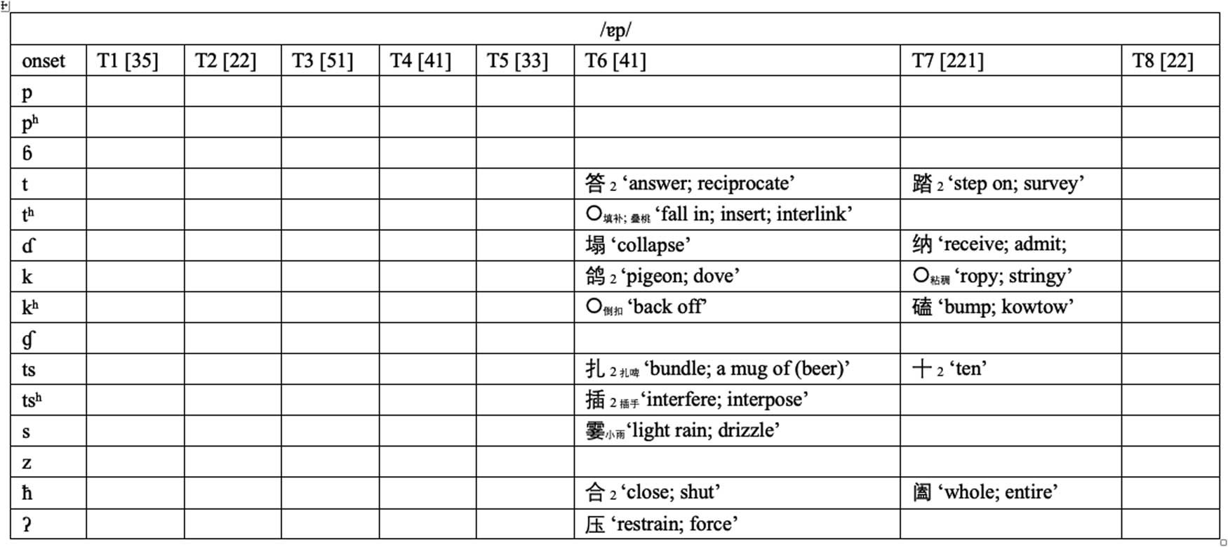 7 Yangru [221] tɔk221 ‘poison’ tsɐp221 ‘ten’ sik221 ‘ripe’