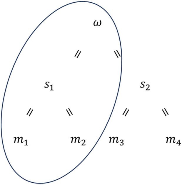 In this diagram, ω , s i , and m j , respectively, represent the world, individual selves, and material things. They are connected by = , a non-standard relation of identity. Importantly, this gives rise to dialetheism. As = is non-transitive, items indirectly connected through an intermediary item in the higher category remain distinct. Thus, while we have ω = s 1 and ω = s 2 , s 1 and s 2 are not identical. Now, let φ be a predicate “ x is identical with s 1 .” Then, as ω = s 1 , there obtains φ ( ω ) . On the other hand, since s 2 s 1 and ω = s 2 , substitution lets us infer ω s 1 , i.e. ¬ φ ( ω ) . Hence, we obtain a dialetheia φ ( ω ) and ¬ φ ( ω ) . Intuitively, what this means is that the world is and is not identical with an individual self, for example, the I. At the same time, as I am connected to the material things I am interacting with and thereby to the world, the part of the structure thus connected (corresponding to the circled portion of the diagram) expresses what Deguchi calls the broad self. According to Deguchi, Nishida’s active intuition is nothing but this broad self, and all the entities in Nishida’s system exist only in the context of active intuition. Thus, Deguchi’s dialetheic model faithfully captures the way the world, the self, and material things interdependently and contradictorily exist in Nishida’s system.