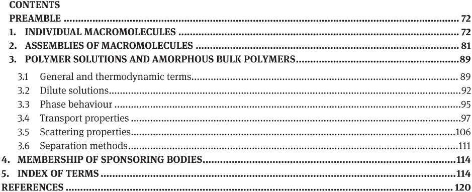 This document defines terms relating to the properties of individual macromolecules, macromolecular assemblies, polymer solutions, and amorphous bulk polymers. In the section on polymer solutions and amorphous bulk polymers, general and thermodynamic terms, dilute solutions, phase behaviour, transport properties, scattering methods, and separation methods are considered. The recommendations are a revision and expansion of the IUPAC terminology published in 1989 dealing with individual macromolecules, macromolecular assemblies, and dilute polymer solutions. New terms covering the principal theoretical and experimental developments that have occurred over the intervening years have been introduced. Polyelectrolytes are not included.