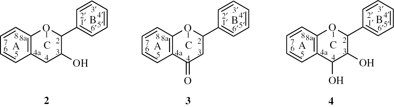 Flavans are compounds with a 2-phenyl-3,4-dihydro-2H-1-benzopyran skeleton 1, that may be substituted, and include flavan-3-ols (compounds derived from 2-phenyl-3,4-dihydro-2H-1-benzopyran-3-ol skeleton 2) and flavan-4-ones (compounds derived from 2-phenyl-2,3-dihydro-4H-1-benzopyran-4-one skeleton 3), which are generically designated as flavanols and flavanones, respectively. Compounds derived from 2-phenyl-3,4-dihydro-2H-1-benzopyran-3,4-diol skeleton 4 are flavan-3,4-diols, designated leukoanthocyanidins because these colourless compounds have their structure derived from that of an anthocyanidin (see Flv-2.1.1.3), specifically they are dehydronated 3,4-dihydroxy-1,2,3,4-tetrahydroanthocyanidins.