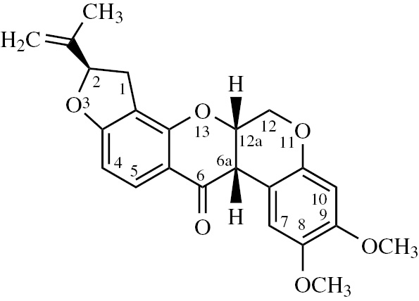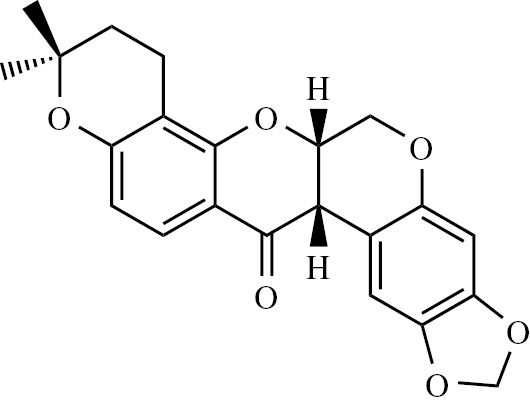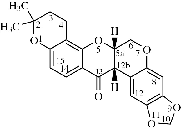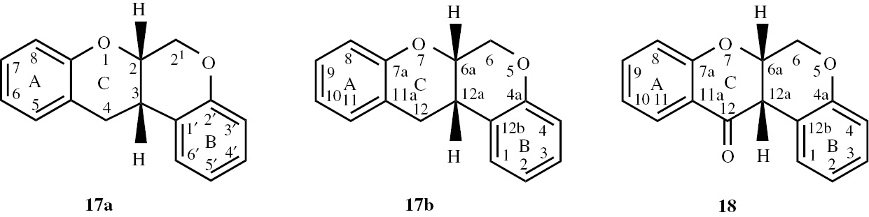Rotenoids comprise rotenanes, which are compounds with a (6aS,12aS)-6,6a,12,12a-tetrahydro[1]-benzopyrano[3,4-b][1]benzopyran skeleton 17b, and rotenones, with a (6aS,12aS)-6a,12a-dihydro[1]-benzopyrano[3,4-b][1]benzopyran-12(6H)-one skeleton 18. They may be substituted. Since the name rotenone has been used not only for the functional parent 18, but also for a more substituted specific compound (see Example 56 in Flv-3.6.6), names based on rotenone are no longer acceptable. Rotenoids are numbered as in 17a when named as rotenane derivatives, but when named systematically, the numbering rules for fused ring systems apply, as in 17b (see P-25.3.3 [6] and FR-5 [10]).