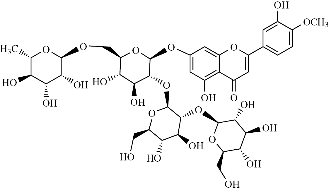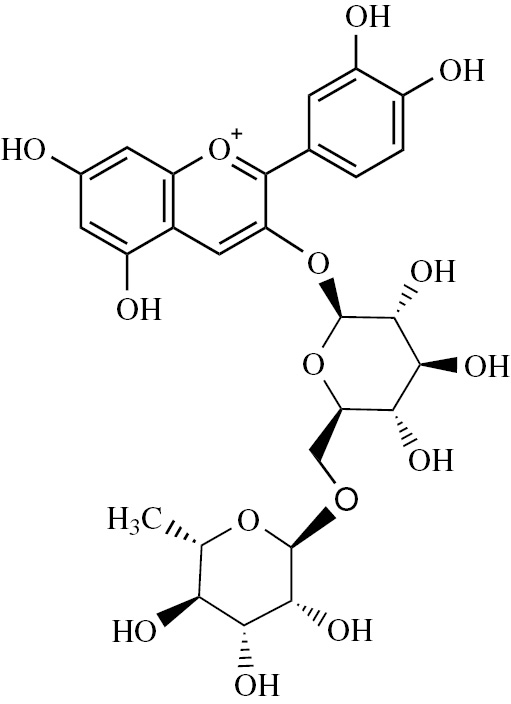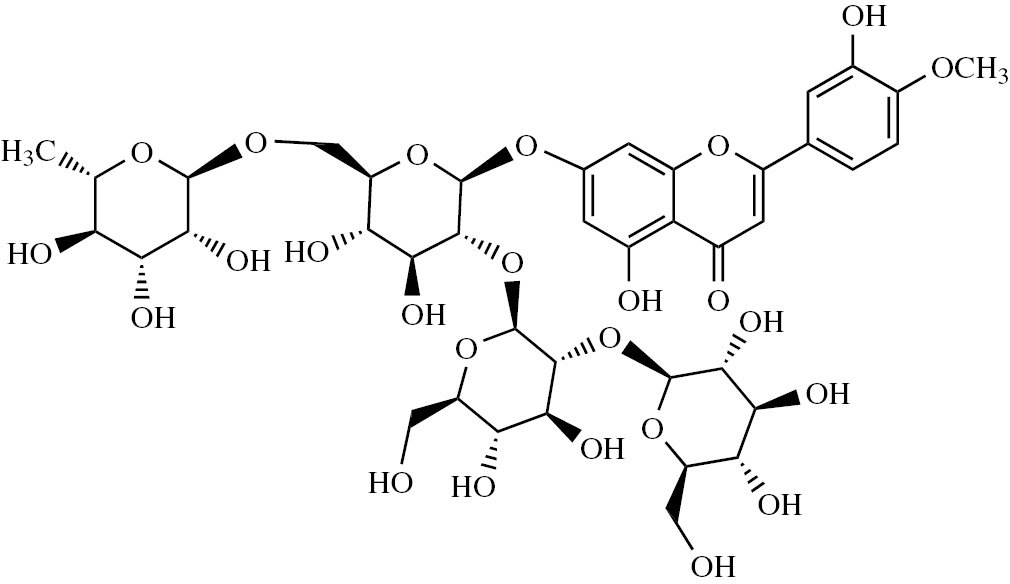 InChI=1S/C27H30O15/c1-9-19(32)21(34)23(36)26(39-9)38-8-18-20(33)22(35)24(37)27(42-18)41-17-7-12-14(30)5-11(28)6-16(12)40-25(17)10-2-3-13(29)15(31)4-10/h2-7,9,18-24,26-27,32-37H,8H2,1H3,(H3-,28,29,30,31)/p+1/t9-,18+, 19-,20+,21+,22-,23+,24+,26+,27+/m0/s1