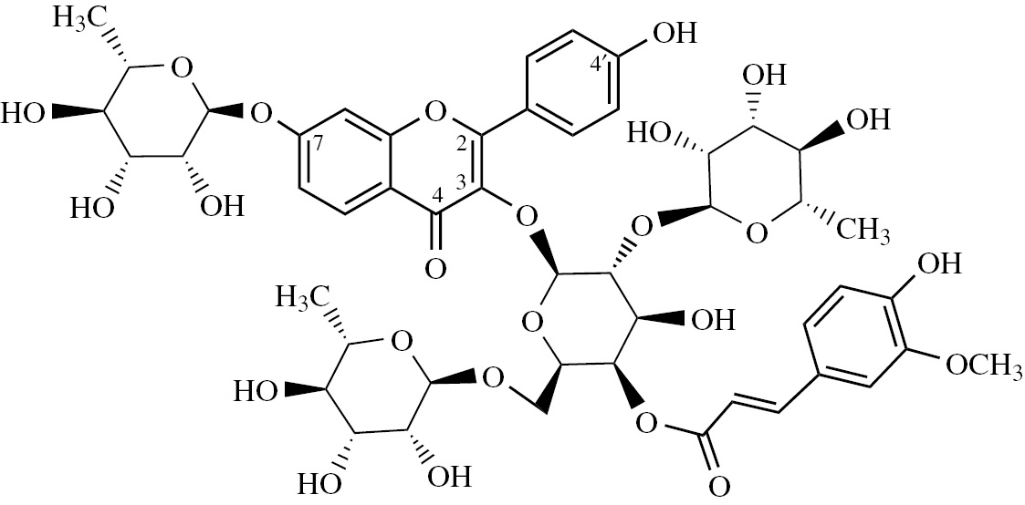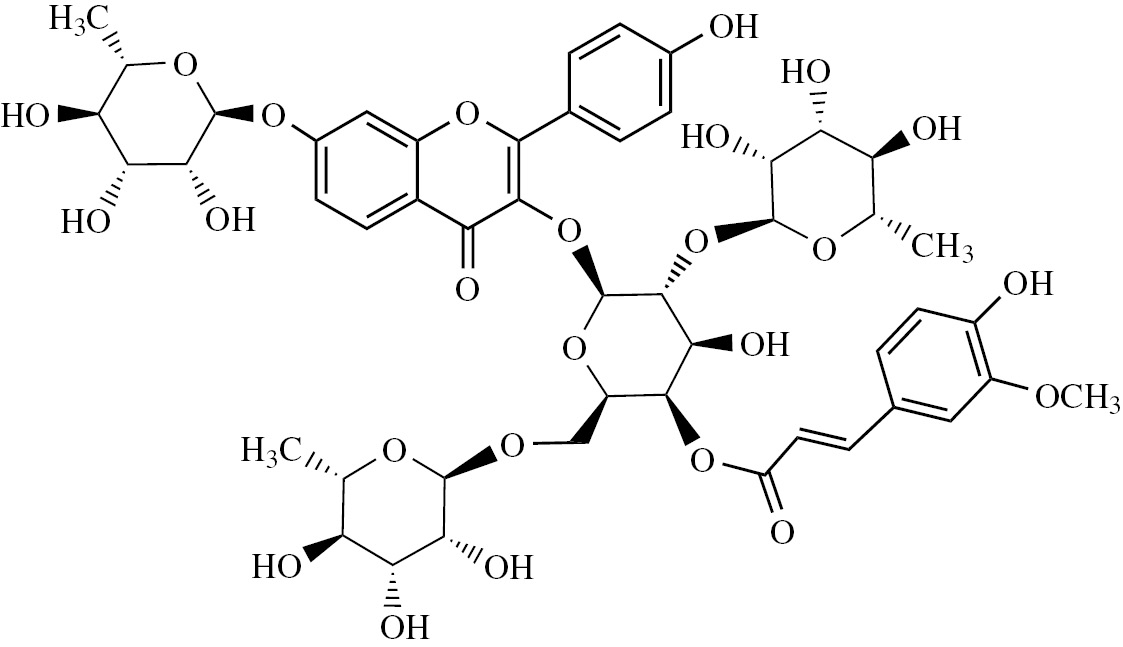 InChI=1S/C49H58O25/c1-18-31(53)35(57)38(60)46(66-18)65-17-29-43(72-30(52)14-6-21-5-13-26(51)28(15-21)64-4)41(63)45(74-48-40(62)37(59)33(55)20(3)68-48)49(71-29)73-44-34(56)25-12-11-24(69-47- 39(61)36(58)32(54)19(2)67-47)16-27(25)70-42(44)22-7-9-23(50)10-8-22/h5-16,18-20,29,31-33,35-41,43,45-51,53-55,57-63H,17H2,1-4H3/b14-6+/t18-,19-,20-,29+,31-,32-,33-,35+,36+,37+,38+,39+,40+,41-,43-,45+,46+,47-,48-, 49-/m0/s1