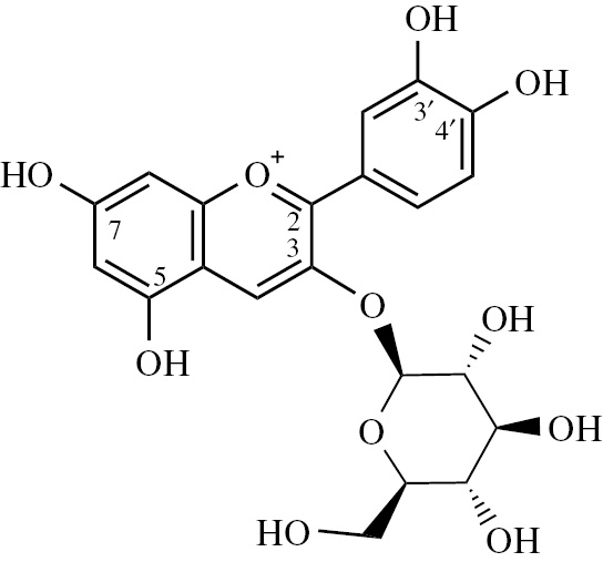 InChI=1S/C21H20O11/c22-7-16-17(27)18(28)19(29)21(32-16)31-15-6-10-12(25)4-9(23)5-14(10)30- 20(15)8-1-2-11(24)13(26)3-8/h1-6,16-19,21-22,27-29H,7H2,(H3-,23,24,25,26)/p+1/t16-,17-,18+,19-,21-/m1/s1