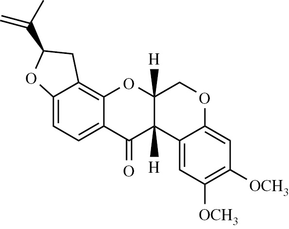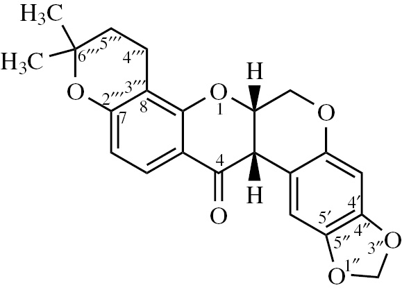InChI=1S/C22H20O6/c1-22(2)6-5-11-14(28-22)4-3-12-20(23)19-13-7-16-17(26-10-25-16)8-15(13)24-9-18(19)27-21(11)12/h3-4,7-8,18-19H,5-6,9-10H2,1-2H3/t18-,19+/m1/s1