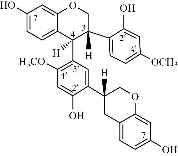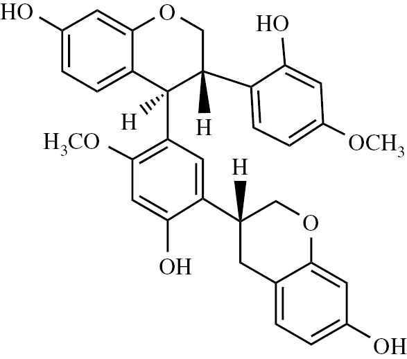 InChI=1S/C32H30O8/c1-37-21-6-8-22(27(35)12-21)26-16-40-31-11-20(34)5-7-23(31)32(26)25-13-24(28(36)14- 30(25)38-2)18-9-17-3-4-19(33)10-29(17)39-15-18/h3-8,10-14,18,26,32-36H,9,15-16H2,1-2H3/t18-,26+,32+/m0/s1