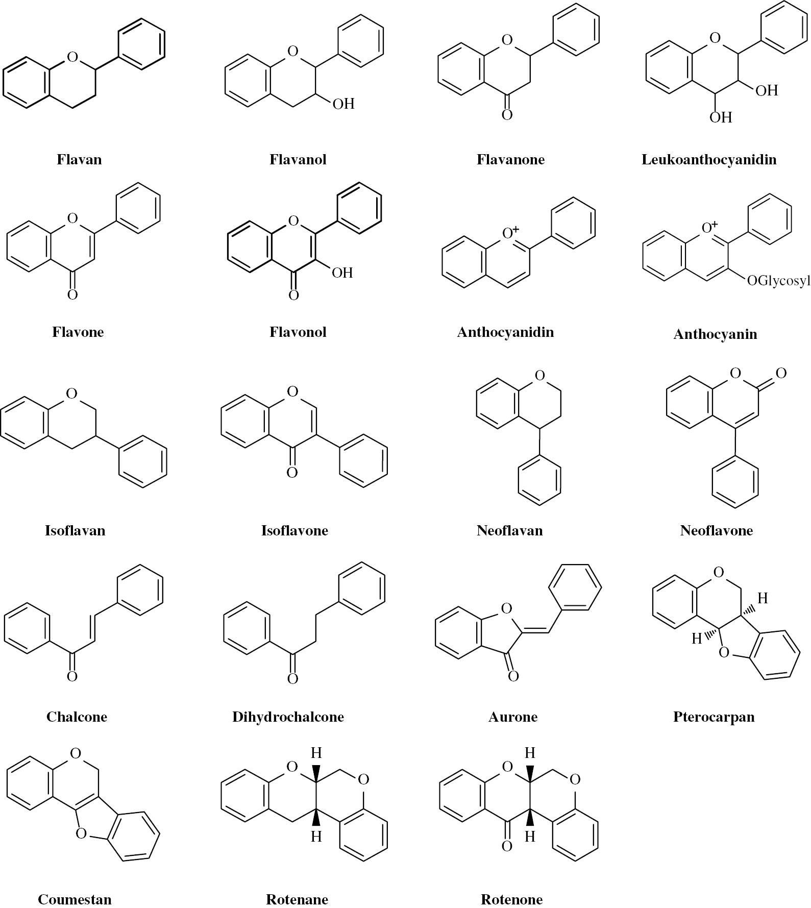 The term “flavonoid” includes natural and synthetic products and is applied to: (1) compounds whose structural feature is based on derivatives of a phenyl-substituted propylbenzene (in the literature commonly termed 1-phenylpropane) possessing a C15 skeleton; (2) compounds having a C16 skeleton that are phenyl-substituted propylbenzene derivatives (rotenoids); (3) flavonolignans, whose structure is based on derivatives of phenyl-substituted propylbenzene condensed with C6-C3 lignan [12] precursors.