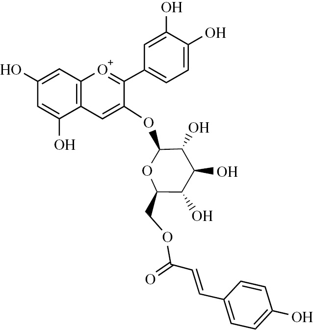 InChI=1S/C30H26O13/c31-16-5-1-14(2-6-16)3-8-25(36)40-13-24-26(37)27(38)28(39)30(43-24)42-23-12-18-20(34)10-17(32)11-22(18)41-29(23)15-4-7-19(33)21(35)9-15/h1-12,24,26-28,30,37-39H,13H2,(H4-,31,32,33,34,35,36)/p+1/t24-,26-,27+,28-,30-/m1/s1
