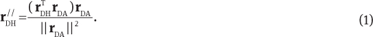 Here the difficulty arises that in order to assign molecules to either the QM or MM zone, the topology of the molecular units (i.e., which atoms form a water, hydroxide, oxonium, etc.) at each step of the simulation has to be known. Since this topology can change over time as protons are transferred between the individual species, the simulation software has to automatically monitor all occurring proton-transfer events and update the respective topology accordingly. In order to achieve this in molecular simulations, a simple yet effective update criterion has been proposed [117]. First, the component of the donor hydrogen distance rDH parallel to the donor–acceptor distance rDA is computed via vector projection: