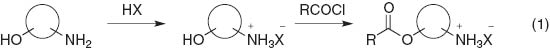 Pre-protonation of alkyl amino groups by highly acidic reagents such as hydrochloric acid and trifluoroacetic acid is a straightforward route for the esterification of aliphatic amino alcohols (eq. 1). A unique example was reported by Takata and Kihara et al. who used rotaxane compounds for a O-selective acylation followed by N-acylation to lock the rotaxane structure (Scheme 1) [3]. Copper ions were coordinated in a chelating fashion to amino acid functionalities so that the hydroxyl group was esterified, and then removed by hydrogen sulfide [4] or 8-hydroxyquinoline (Scheme 2) [5].