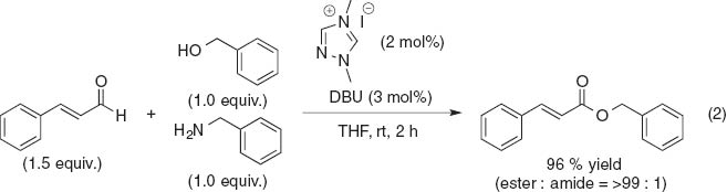 Studer et al. developed N-heterocyclic carbene (NHC), which mediates the chemoselective acylation of alcohols in the presence of amines (eq. 2) [8]. The DFT calculations on NHC–H2NMe and NHC–HOMe indicate that the stronger hydrogen bonding energy for NHC–HOMe than that for NHC–H2NMe elongates the O–H bond.