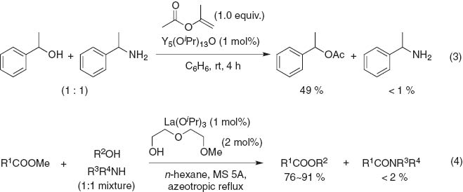 Lin and RajanBabu reported yttrium-catalyzed selective O-acylation over N-amidation using Y5(OiPr)13O as a catalyst to promote the selective O-acetylation of amino alcohols without the formation of the amide by activated acylation reagents such as vinyl or isopropenyl acetate [13]. When a stoichiometric mixture of 1-phenylethanol and 1-phenylethanamine is treated with the yttrium catalyst and isopropenyl acetate, the alcohol quantitatively converts to O-acetate and only a trace amount of the N-acetyl derivative is detected (eq. 3). Recently, Ishihara et al. also reported that a La(OiPr)3–2-(2-methoxyethoxy)ethanol catalyst system catalyzes the chemoselective transesterification of methyl esters in the presence of amines (eq. 4) [14].